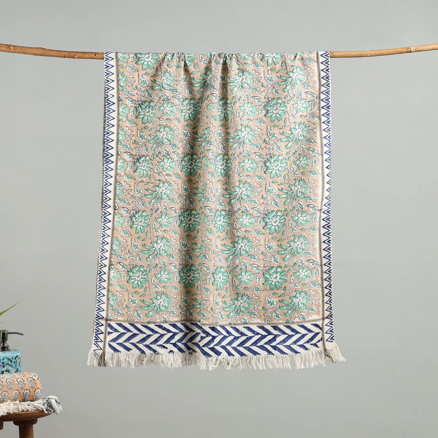 Fine quality brown sanganeri hand block printed pure cotton towel. Sanganeri is a hand-block printing technique originating from Sanganer, a village in the southern part of Jaipur, Rajasthan. Bleed free VAT dyes used. Pure handloom fabric woven in Jhiri, Rajasthan and fine quality block prints by Santosh Dhanopia.