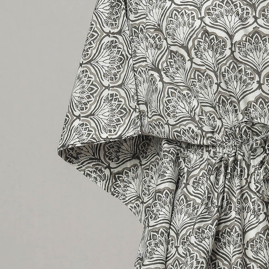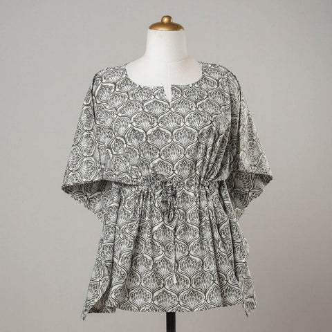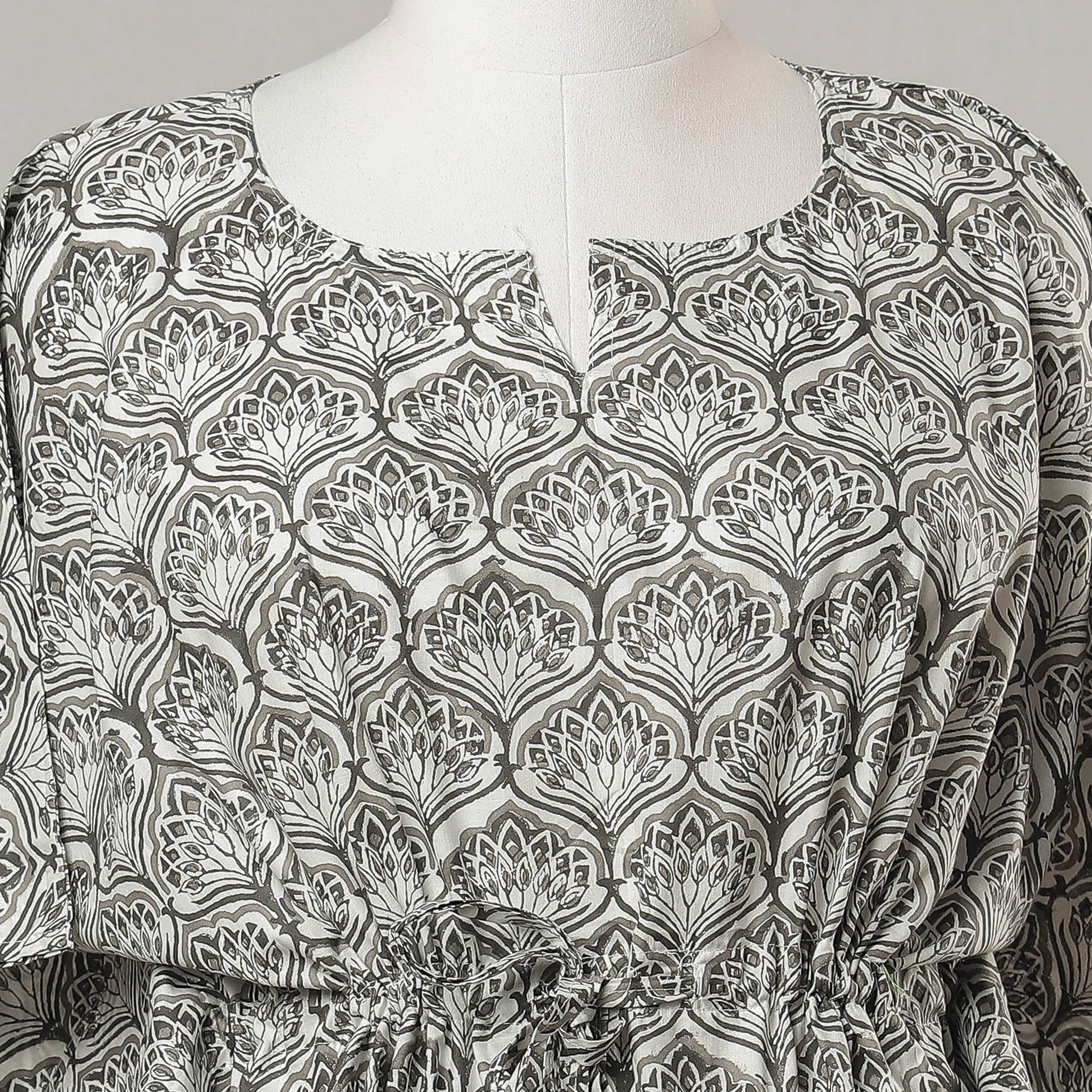 Fine quality sanganeri printed cotton kaftan with tie-up waist. A traditional kaftan or caftan is an short-length garment with long, flowing sleeves. It has an adjustable drawstring waist. These loose-fitting cotton kaftans are enhanced by a soft touch and beautiful hand prints. This dress will allow you to move with ease and comfort. The drawstring waist tie will give you the freedom to customize the fit to suit your unique shape.