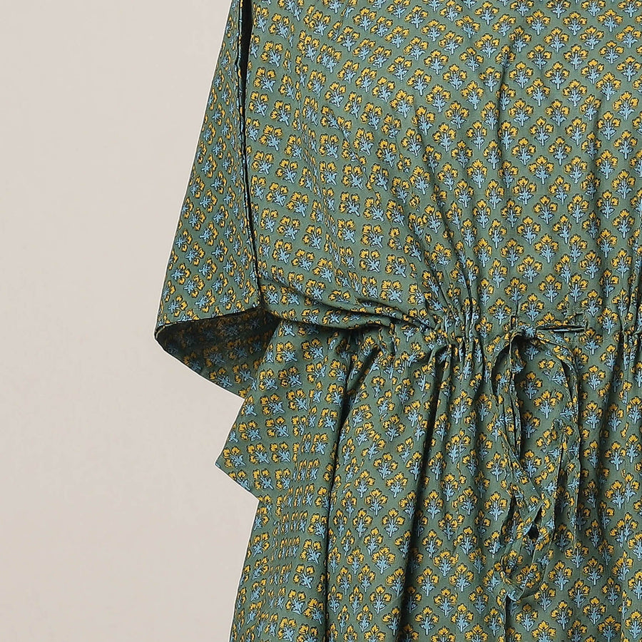 Fine quality sanganeri prints cotton kaftan with tie-up waist. A traditional kaftan or caftan is an knee-length garment with long, flowing sleeves. It has an adjustable drawstring waist. These loose-fitting cotton kaftans are enhanced by a soft touch and beautiful hand prints. This dress will allow you to move with ease and comfort. The drawstring waist tie will give you the freedom to customize the fit to suit your unique shape.