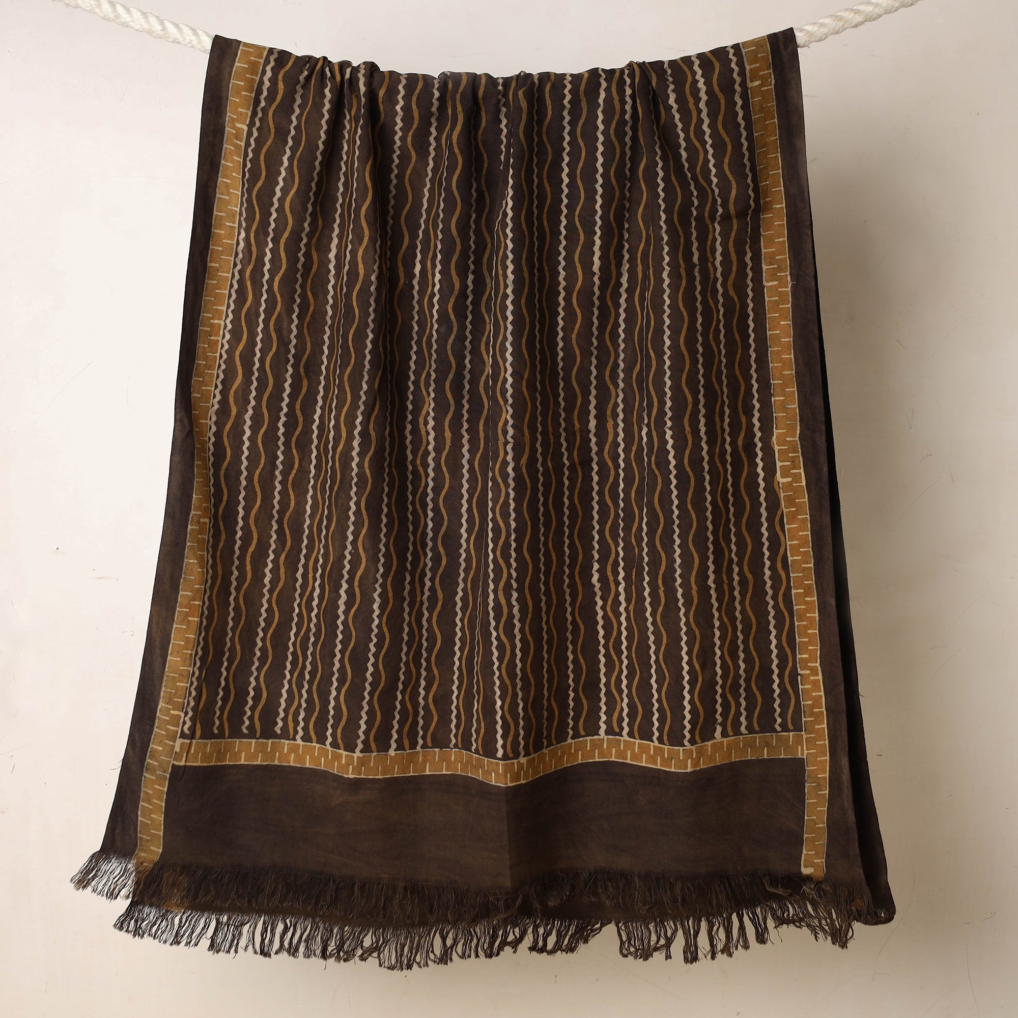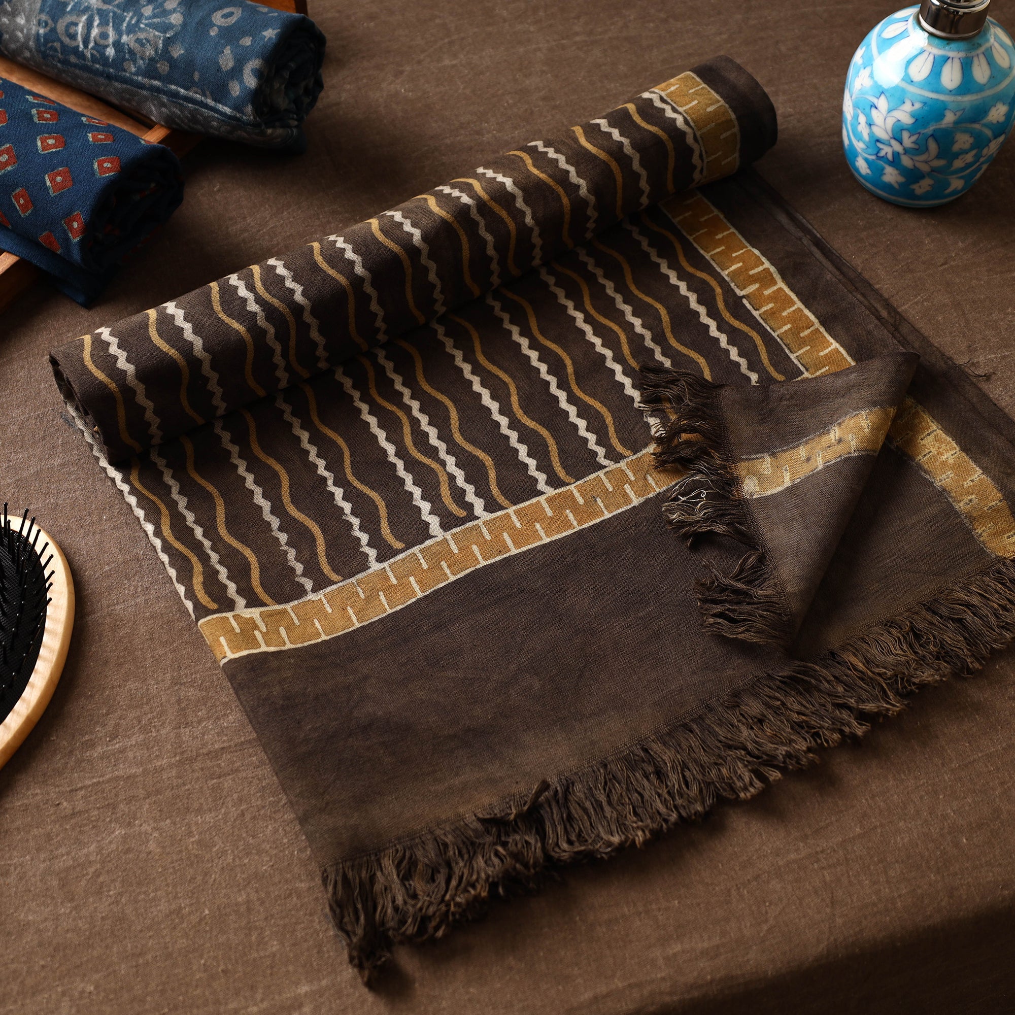 Fine quality brown akola hand block printed pure handloom cotton towel made using natural dyes through traditional process of hand block printing practised in the Akola village of Rajasthan.