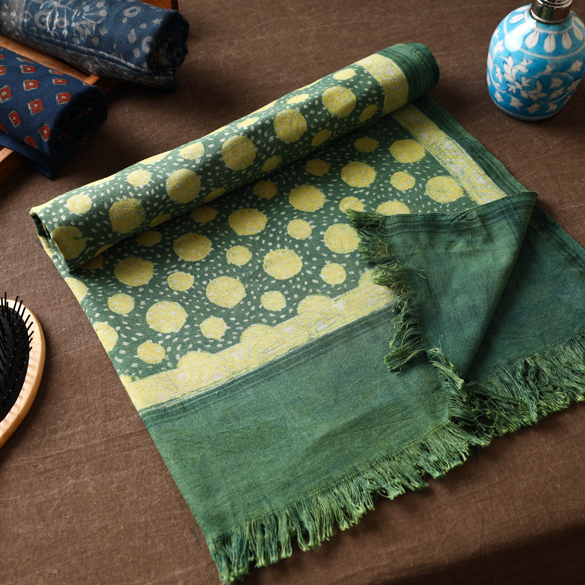 Fine quality green akola hand block printed pure handloom cotton towel made using natural dyes through traditional process of hand block printing practised in the Akola village of Rajasthan.