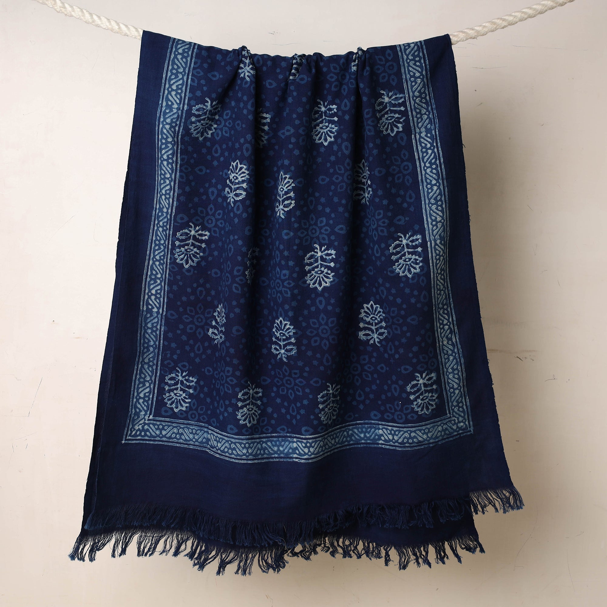 Fine quality blue akola hand block printed pure handloom cotton towel made using natural dyes through traditional process of hand block printing practised in the Akola village of Rajasthan.
