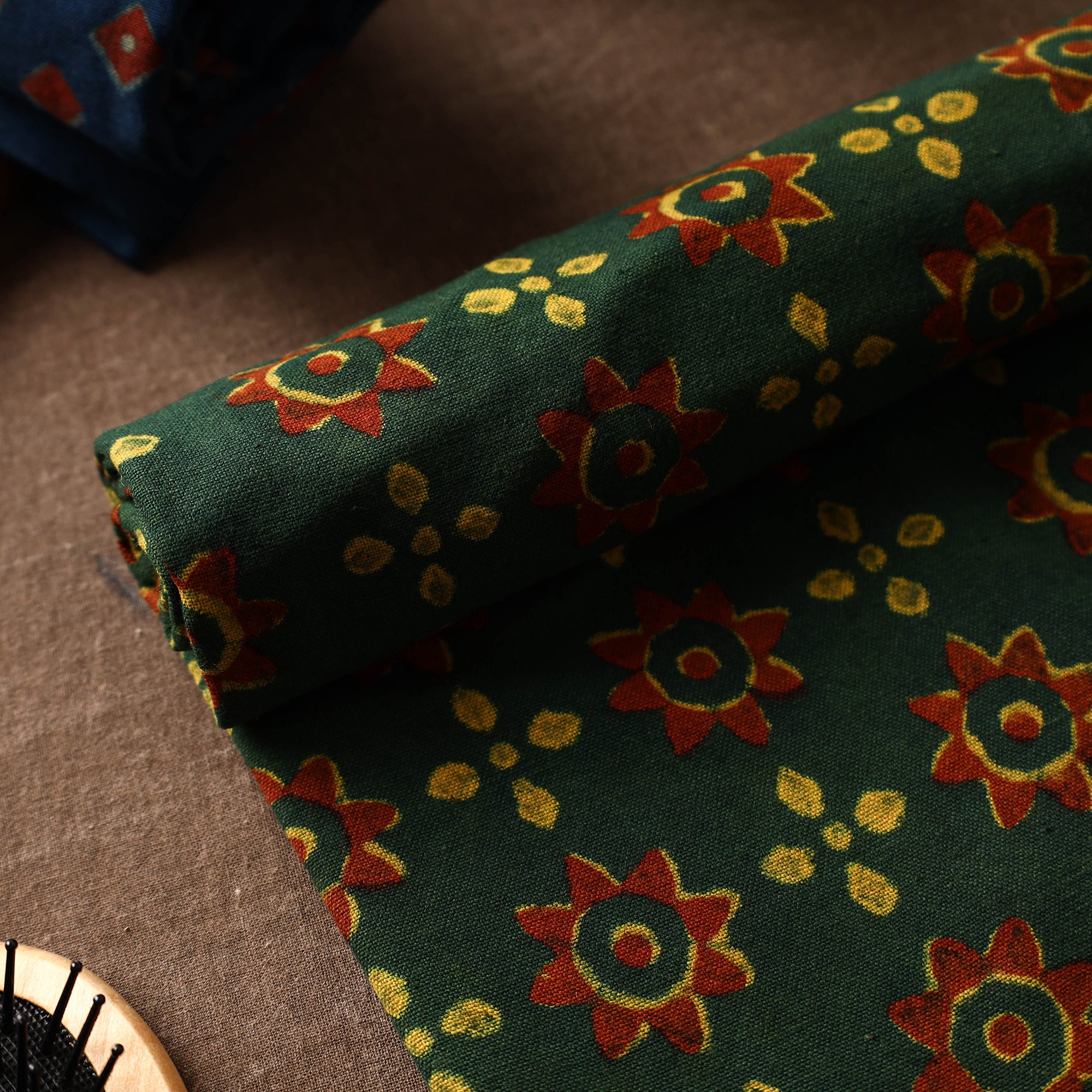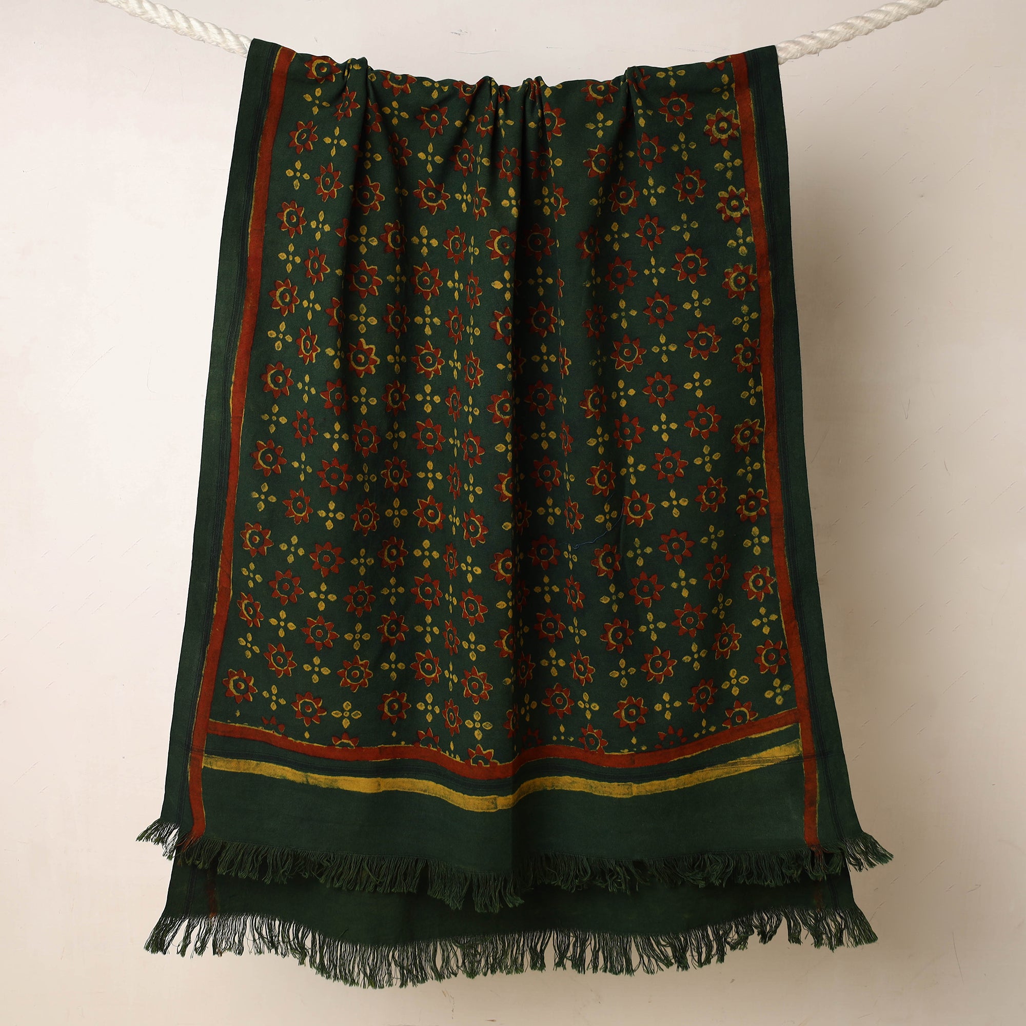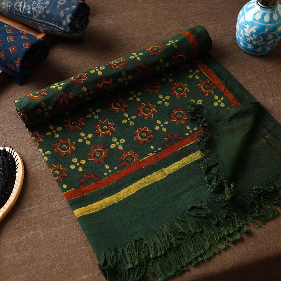 Fine quality green akola hand block printed pure handloom cotton towel made using natural dyes through traditional process of hand block printing practised in the Akola village of Rajasthan.