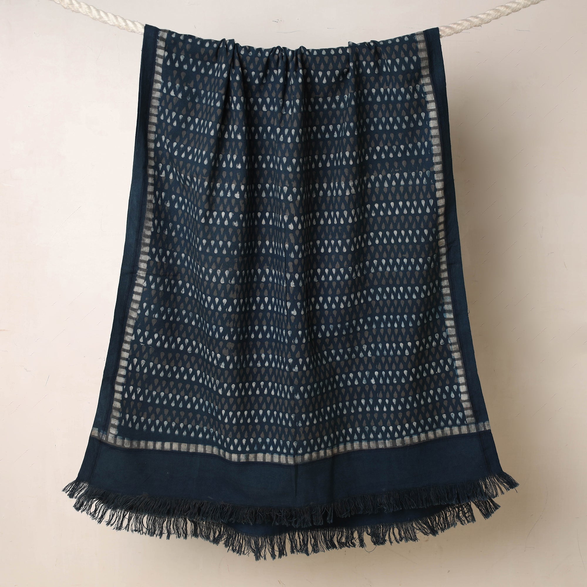 Fine quality blue akola hand block printed pure handloom cotton towel made using natural dyes through traditional process of hand block printing practised in the Akola village of Rajasthan.