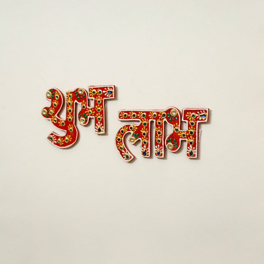 Shubh Laabh - Traditional Handpainted Beadwork Door Decor. This product is studded with beads and stones. It contains double tape on the back side to stick it over the surface. It makes your home and pooja room more beautiful and will surely be admired by your guests.