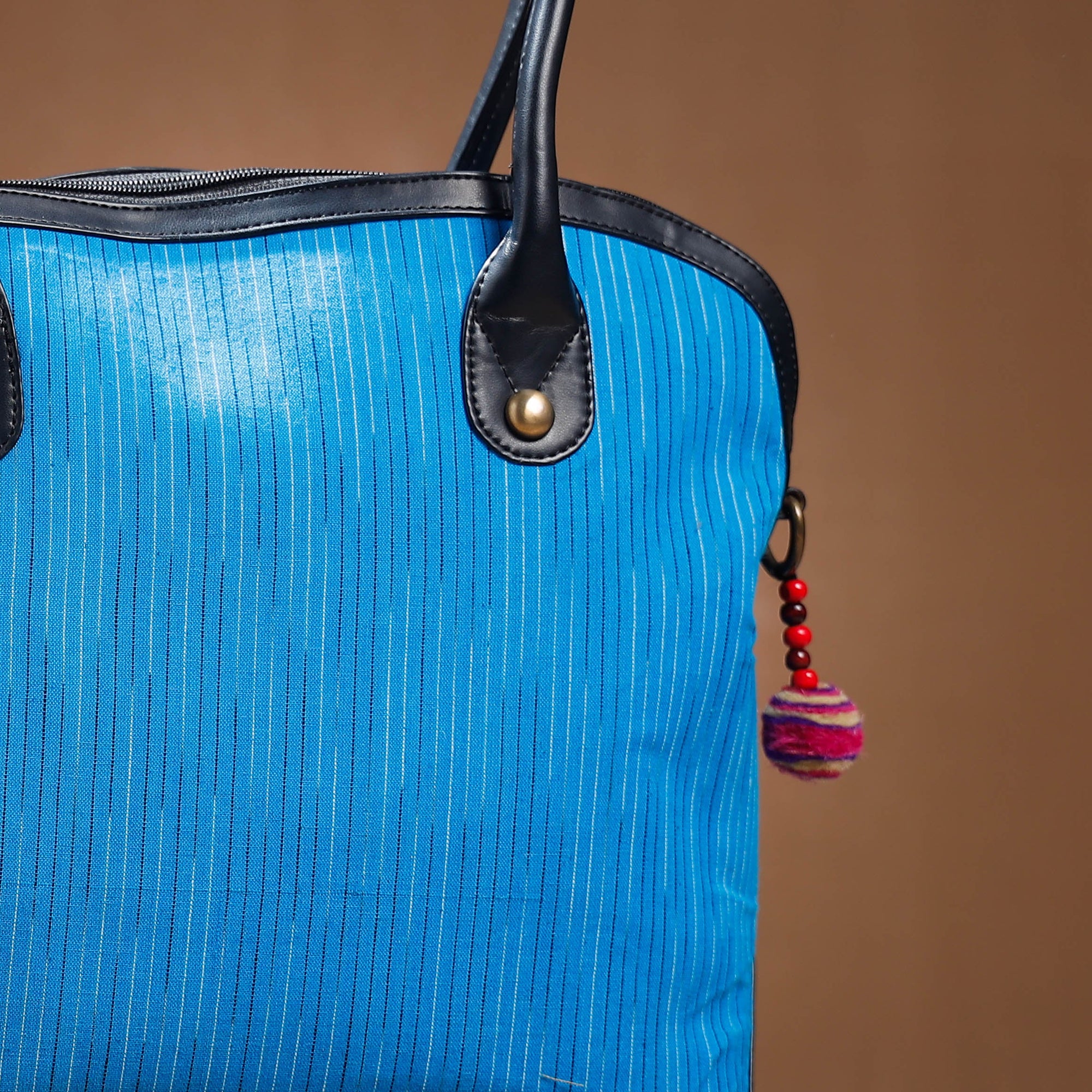 Blue handcrafted ikat woven cotton and faux leather trim shoulder bag. It has ample space to keep most of your essentials, one zipper pocket, two small pockets & cotton fabric lining inside.