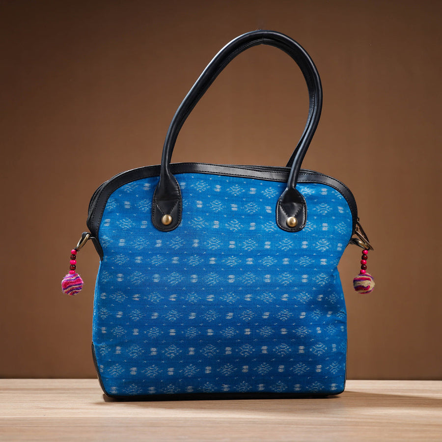 Blue handcrafted ikat woven cotton and faux leather trim shoulder bag. It has ample space to keep most of your essentials, one zipper pocket, two small pockets & cotton fabric lining inside.