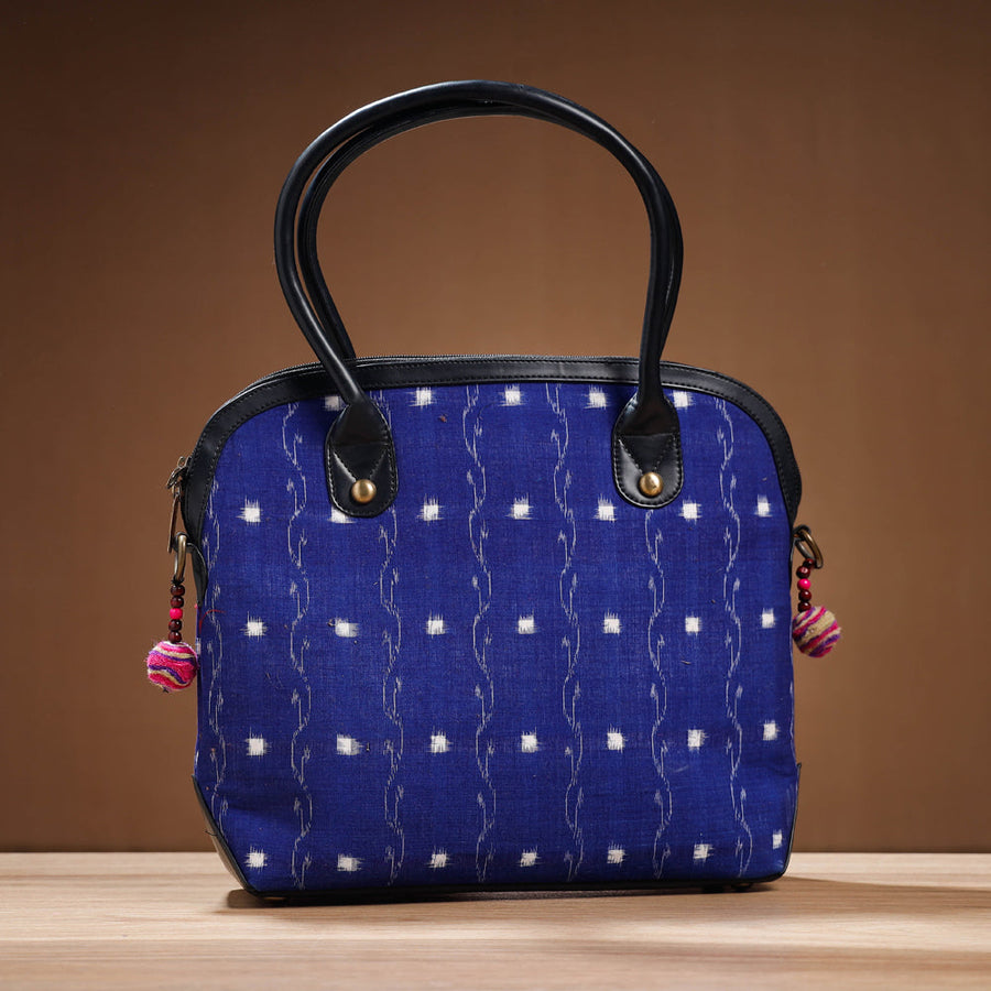 Blue handcrafted ikat woven cotton and faux leather trim shoulder bag. It has ample space to keep most of your essentials, one zipper pocket, two small pockets & cotton fabric lining inside.