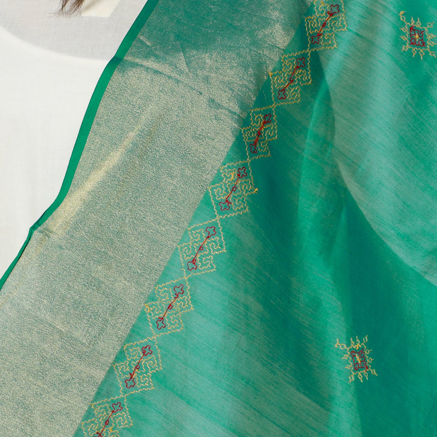 Intricate and artfully done kasuti embroidery on pure handloom maheshwari silk-cotton dupatta. The name Kasuti is derived from the words Kai (meaning hand) and Suti (meaning cotton), indicating an activity that is done using cotton and hands.