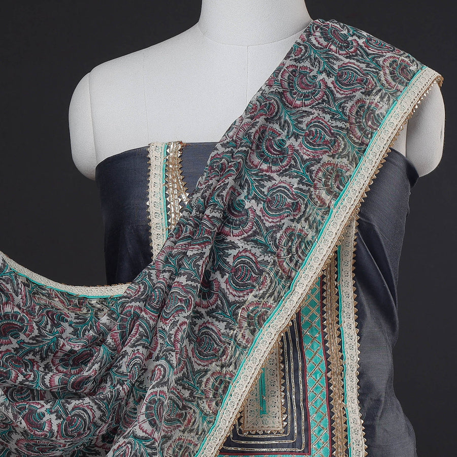 Fine quality sanganeri block printed gota patti work chanderi silk kurta material and dupatta with cotton bottom material. (bottom is of matching colour cotton fabric) Sanganeri is a hand-block printing technique originating from Sanganer, a village in the southern part of Jaipur, Rajasthan. Bleed free VAT dyes used.