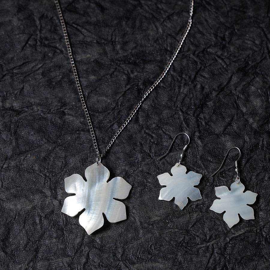 White handcrafted natural seashell necklace set. These unique mother of pearl shell necklace & earrings set are stunning and perfect for any occasion. These necklace sets are a great wardrobe staple and timeless in design. Mother of pearl jewelry and pearl jewelry look very different in a number of ways. Mother of pearl jewelry can have much larger focal pieces than pearls since the substance takes up a whole shell's interior. Mother of pearl is thin and slightly rounded.