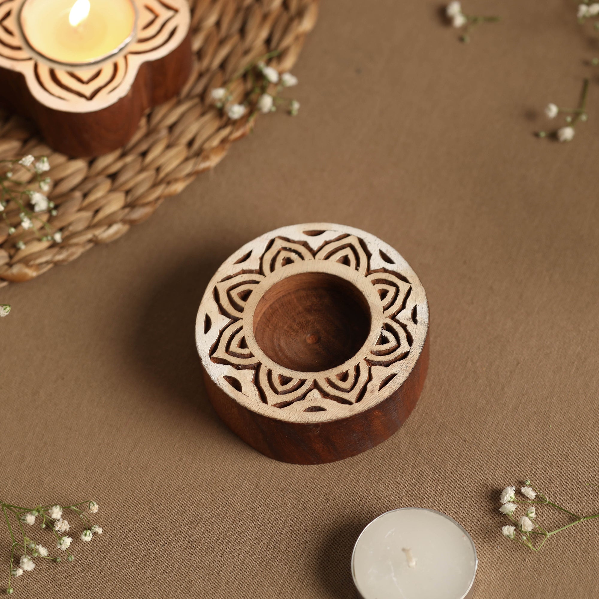 Intricately handcarved natural sheesham wood block tealight candle holder. Motifs are carefully engraved onto flat and smooth blocks of wood by skilful hands. This tea-light candle holder doesn’t just light up your homes, offices or restaurants, but it can also be used for block printing on fabric, paper, canvas, etc.