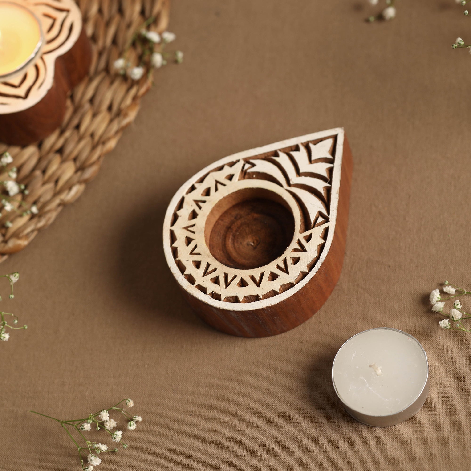 Intricately handcarved natural sheesham wood block tealight candle holder. Motifs are carefully engraved onto flat and smooth blocks of wood by skilful hands. This tea-light candle holder doesn’t just light up your homes, offices or restaurants, but it can also be used for block printing on fabric, paper, canvas, etc.