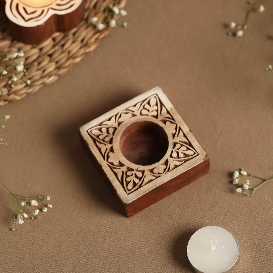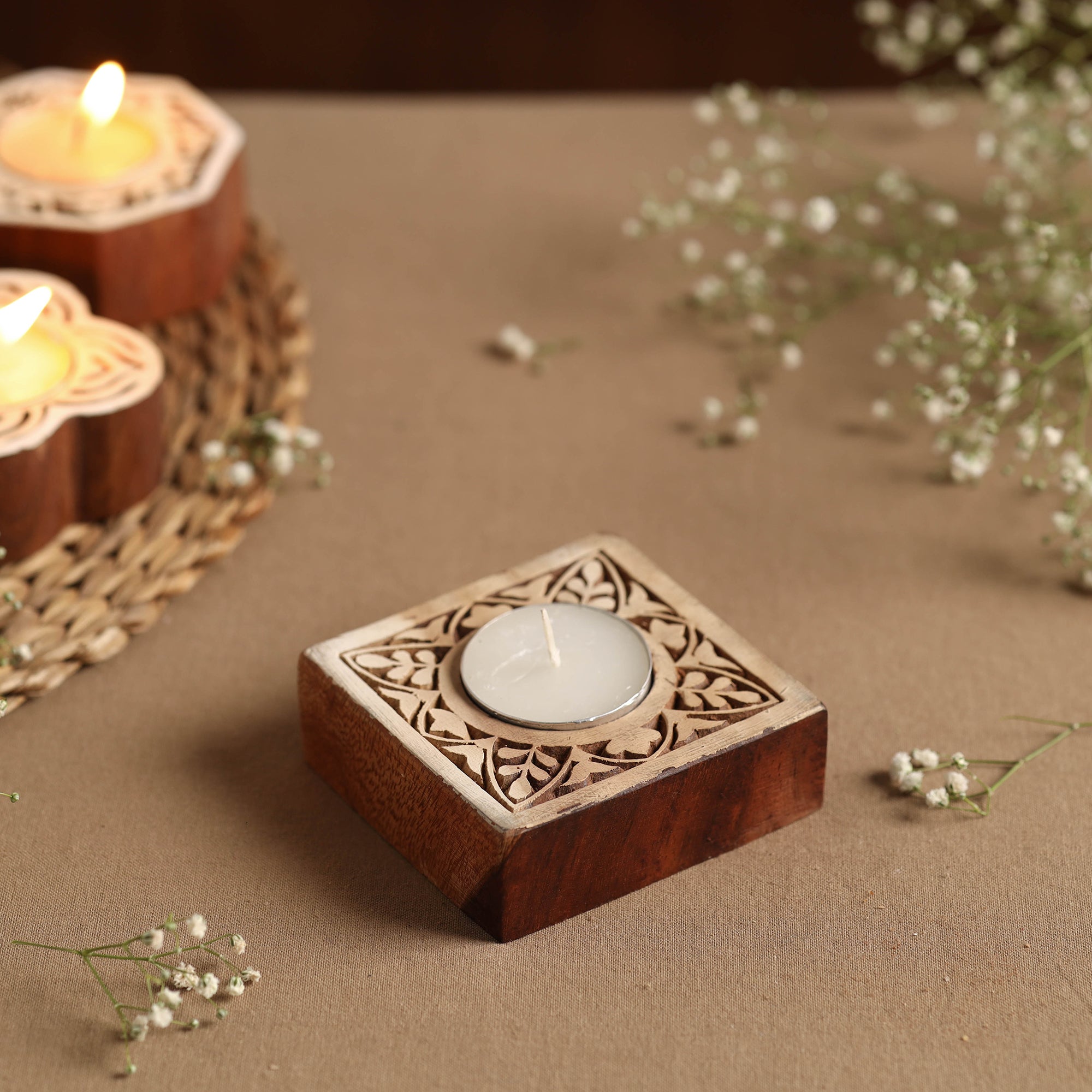 Intricately handcarved natural sheesham wood block tealight candle holder. Motifs are carefully engraved onto flat and smooth blocks of wood by skilful hands. This tea-light candle holder doesn’t just light up your homes, offices or restaurants, but it can also be used for block printing on fabric, paper, canvas, etc.