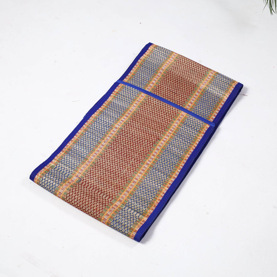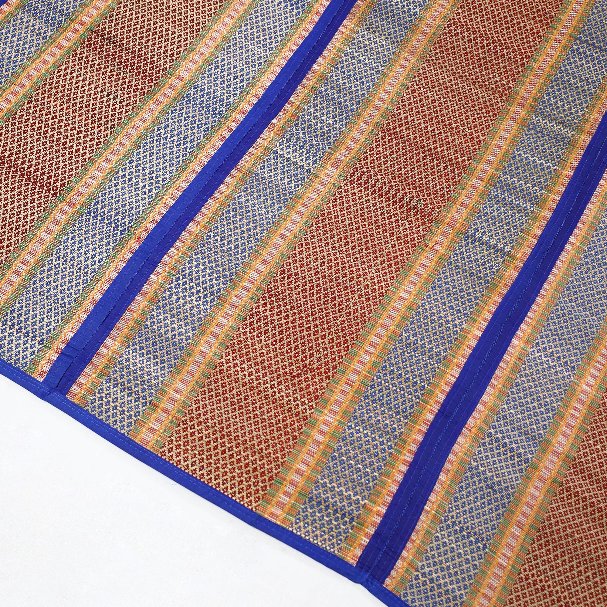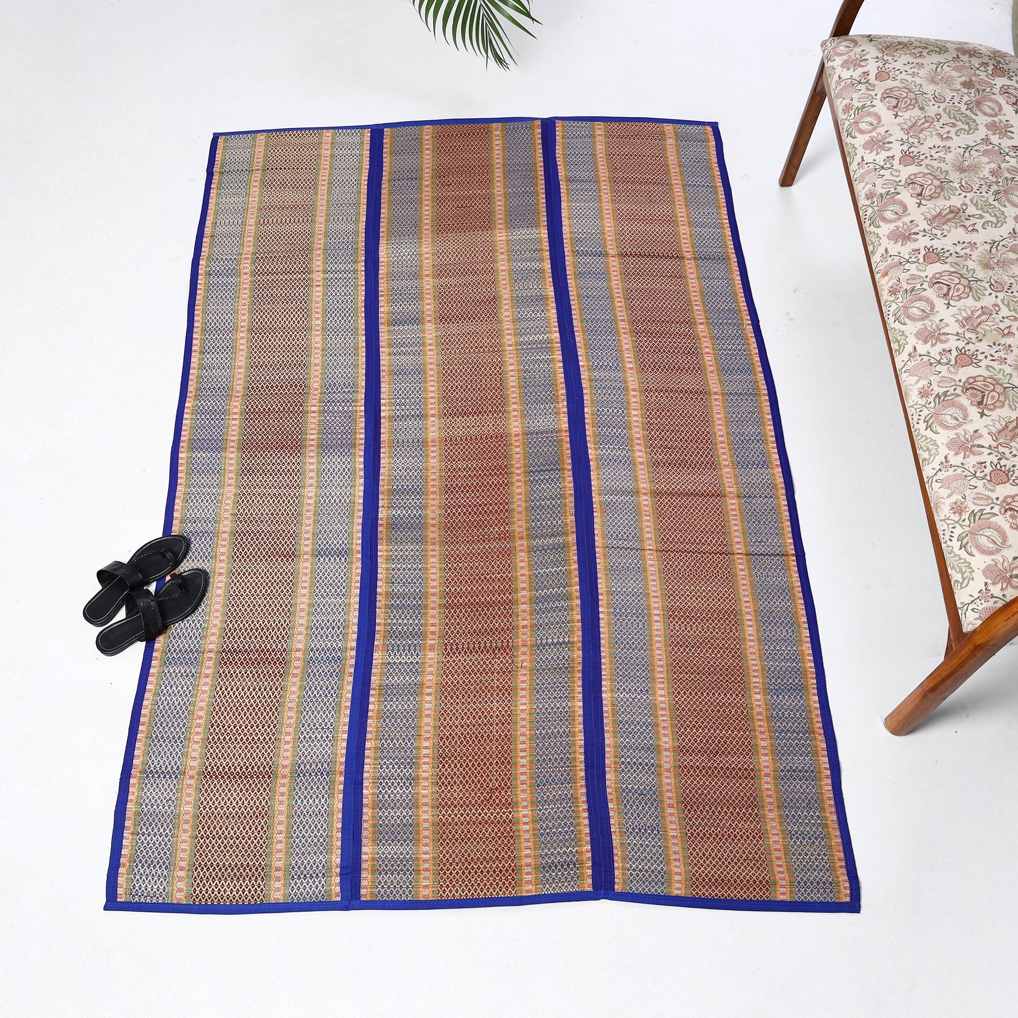 Working around seasonal grasses and traditional colours this handcrafted golden grass weaved 3 fold floor mat / chatai is made with natural madur grass, twisted cotton yarn & madur kathi reed (Cyperus tegetum and C. Pangorie) that grows in the swampy area around Midnapore in West Bengal. The craft of "Madur" weaving is practiced in the residence cum workshops of artisans households with the help of family members.