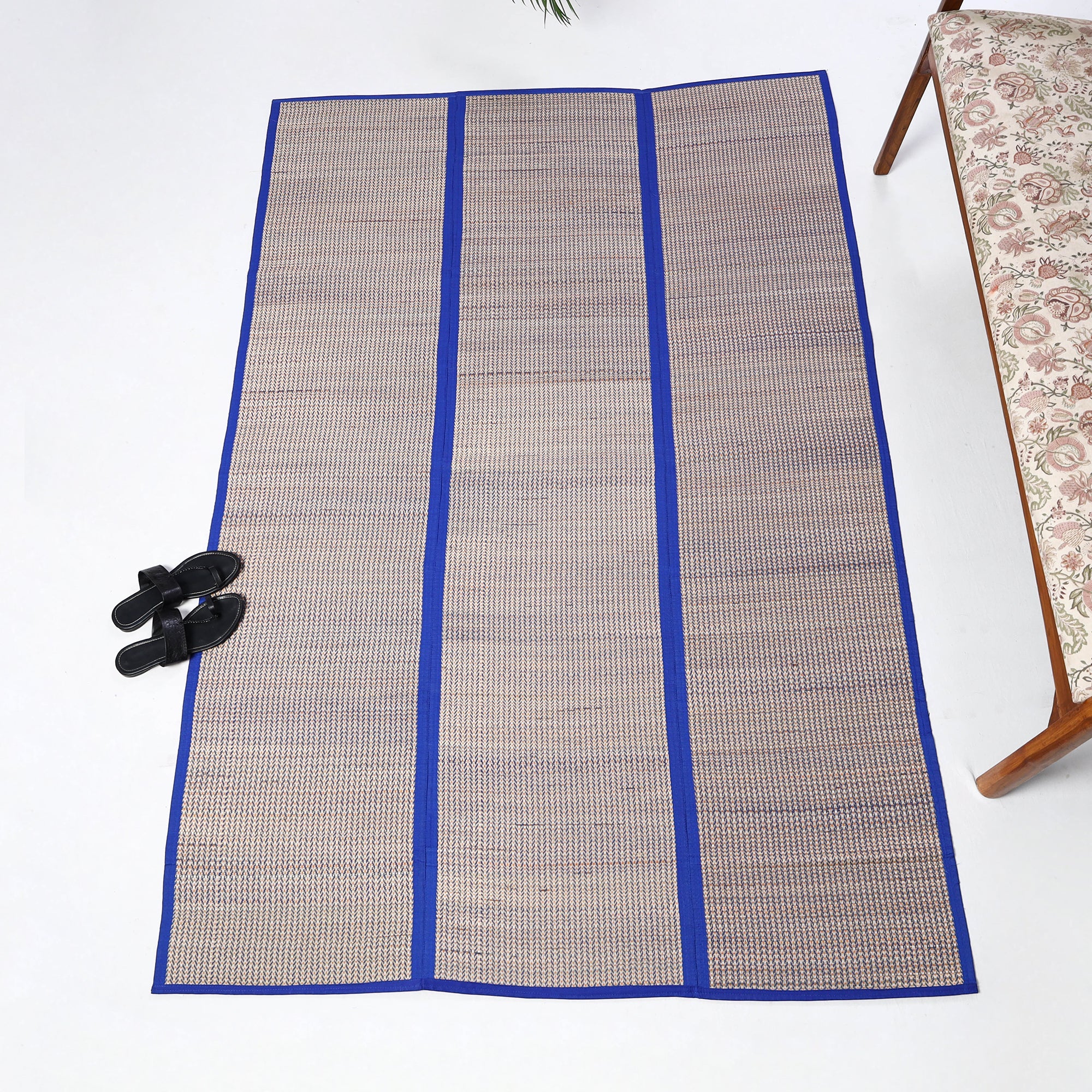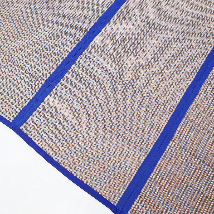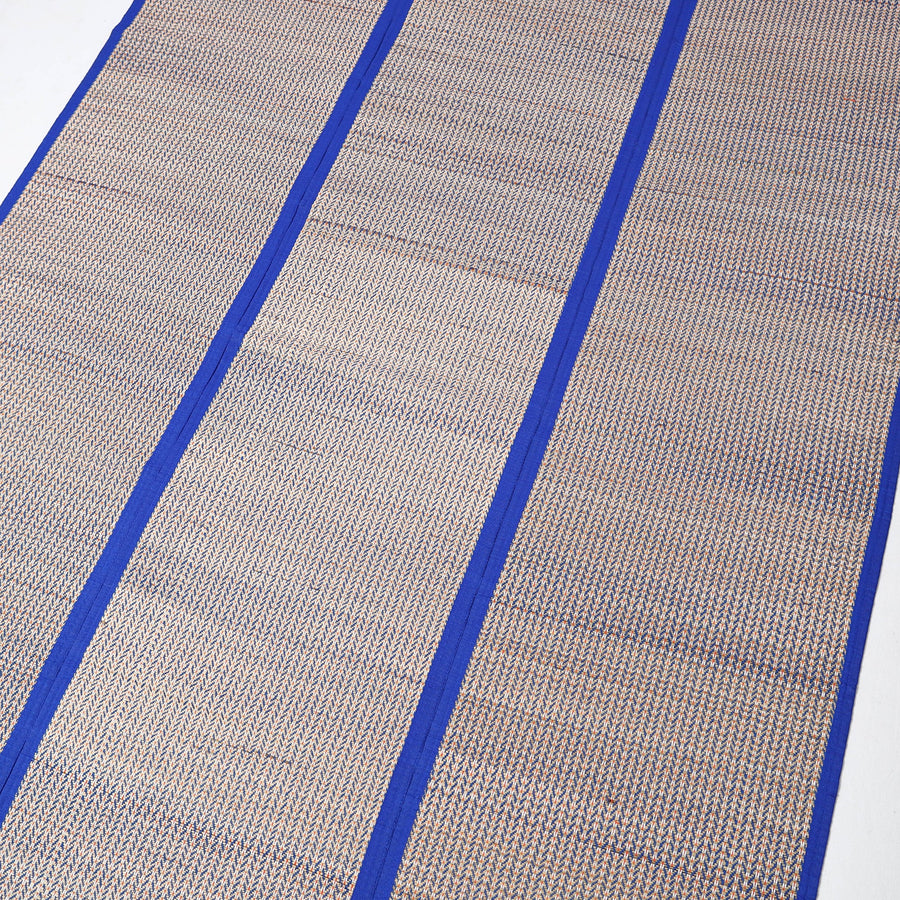 Working around seasonal grasses and traditional colours this handcrafted golden grass weaved 3 fold floor mat / chatai is made with natural madur grass, twisted cotton yarn & madur kathi reed (Cyperus tegetum and C. Pangorie) that grows in the swampy area around Midnapore in West Bengal. The craft of "Madur" weaving is practiced in the residence cum workshops of artisans households with the help of family members.