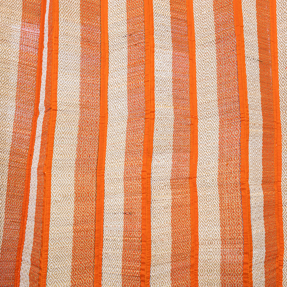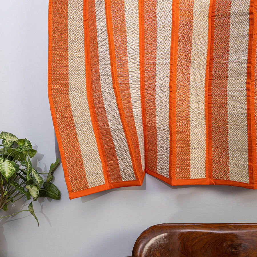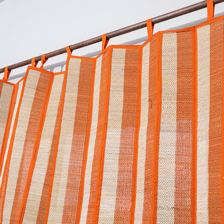 Working around seasonal grasses and traditional colours this handcrafted golden grass weaved curtain is made with natural madur grass, twisted cotton yarn & madur kathi reed (Cyperus tegetum and C. Pangorie) that grows in the swampy area around Midnapore in West Bengal. The craft of "Madur" weaving is practiced in the residence cum workshops of artisans households with the help of family members.