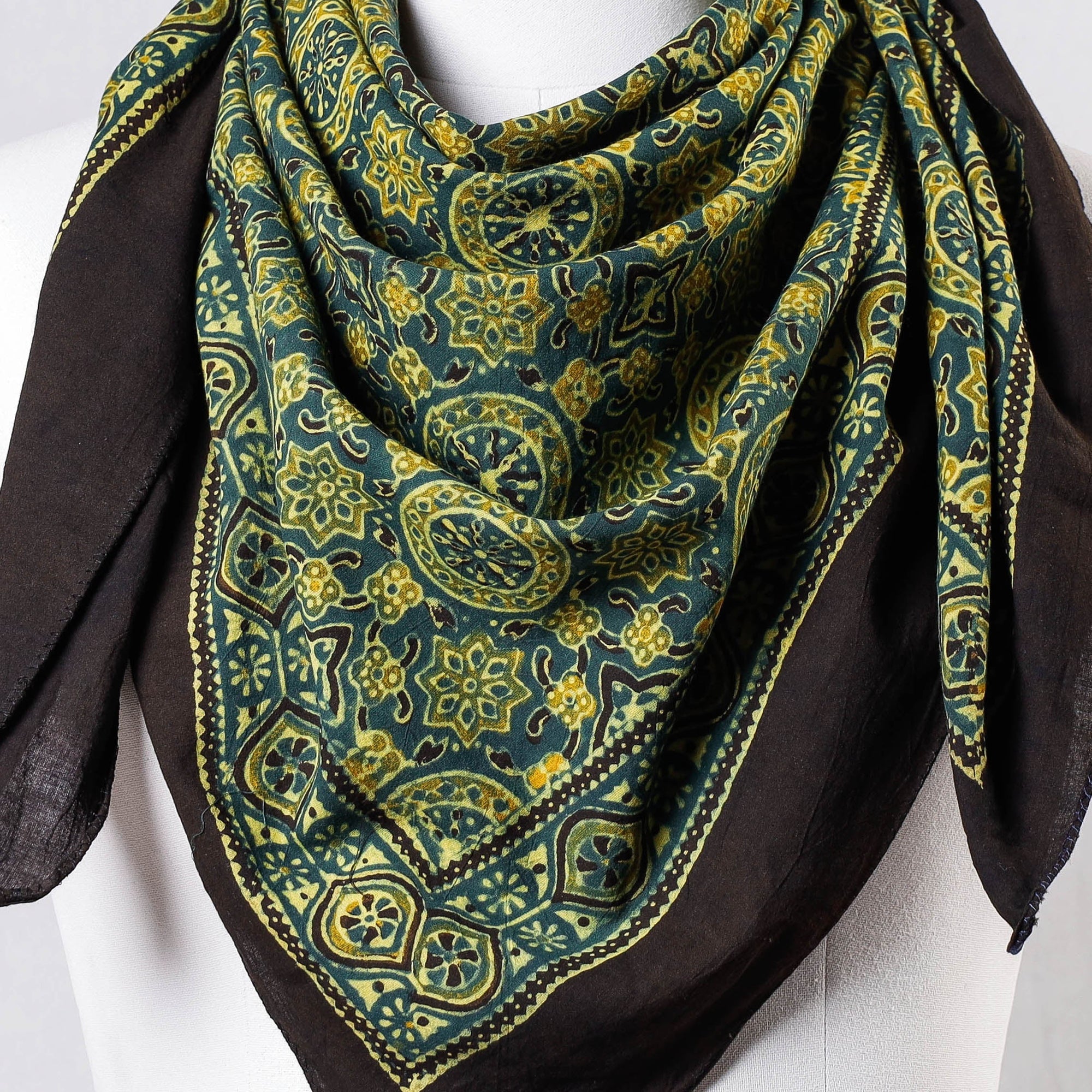 Material Fine quality green ajrakh hand block printing cotton scarf, made using natural dyes through traditional technique of hand block printing by master artisans in Kutch region of Gujarat.
