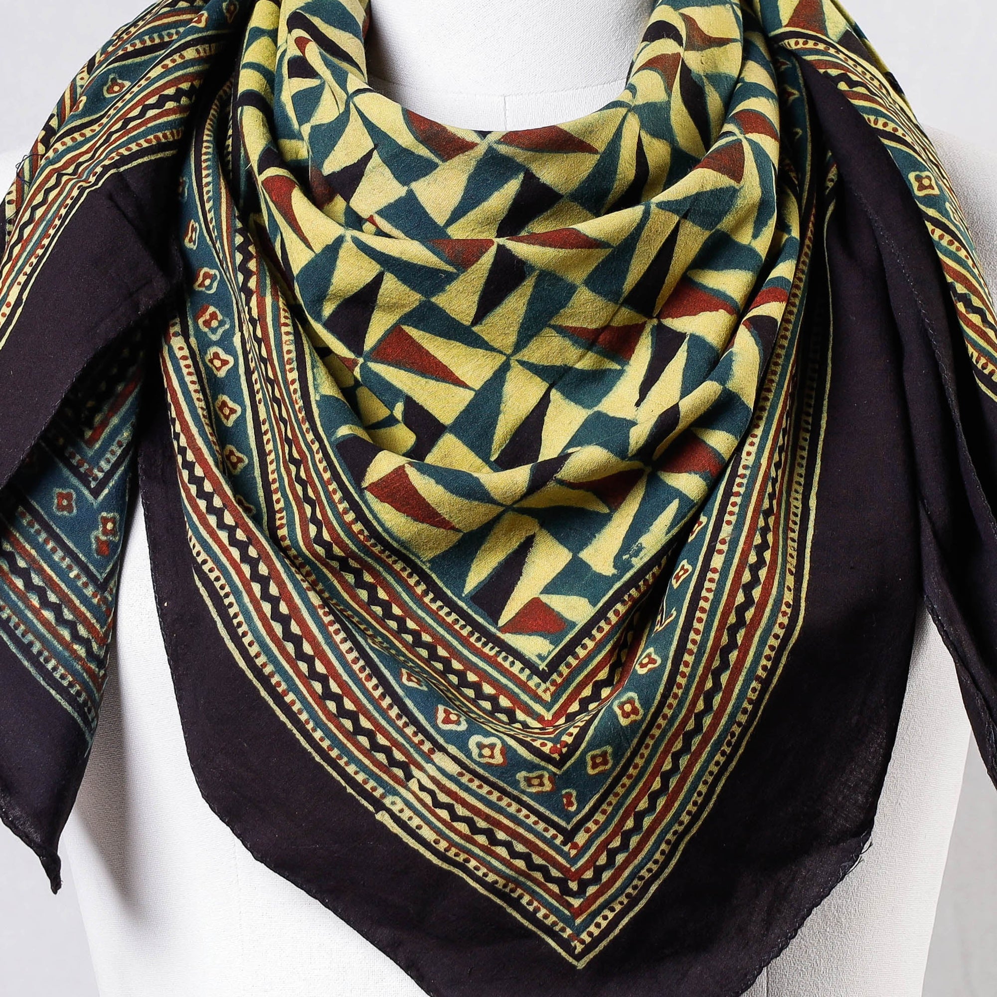 Fine quality green ajrakh hand block printing cotton scarf, made using natural dyes through traditional technique of hand block printing by master artisans in Kutch region of Gujarat.