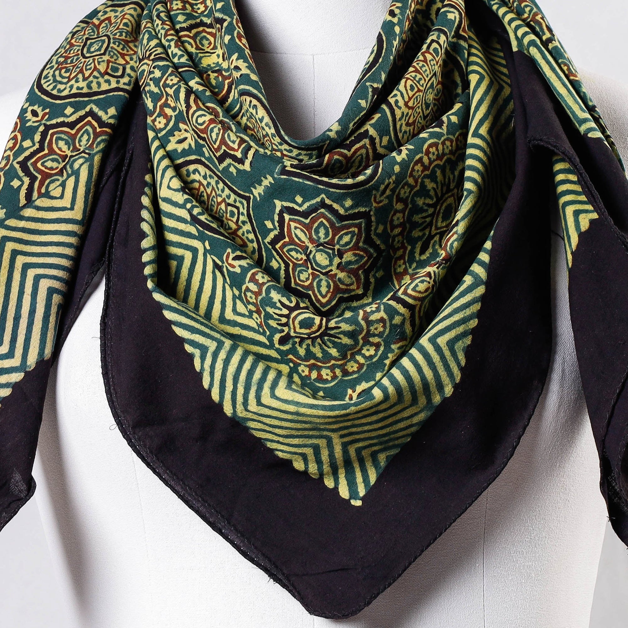 Fine quality green ajrakh hand block printing cotton scarf, made using natural dyes through traditional technique of hand block printing by master artisans in Kutch region of Gujarat.