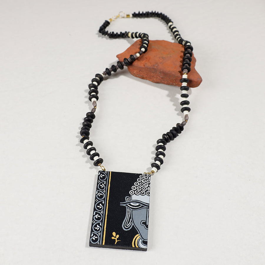 Material Black handpainted miniature painting pine wood (MDF) necklace with beads by Rajesh & MonaliAcrylic colours used.