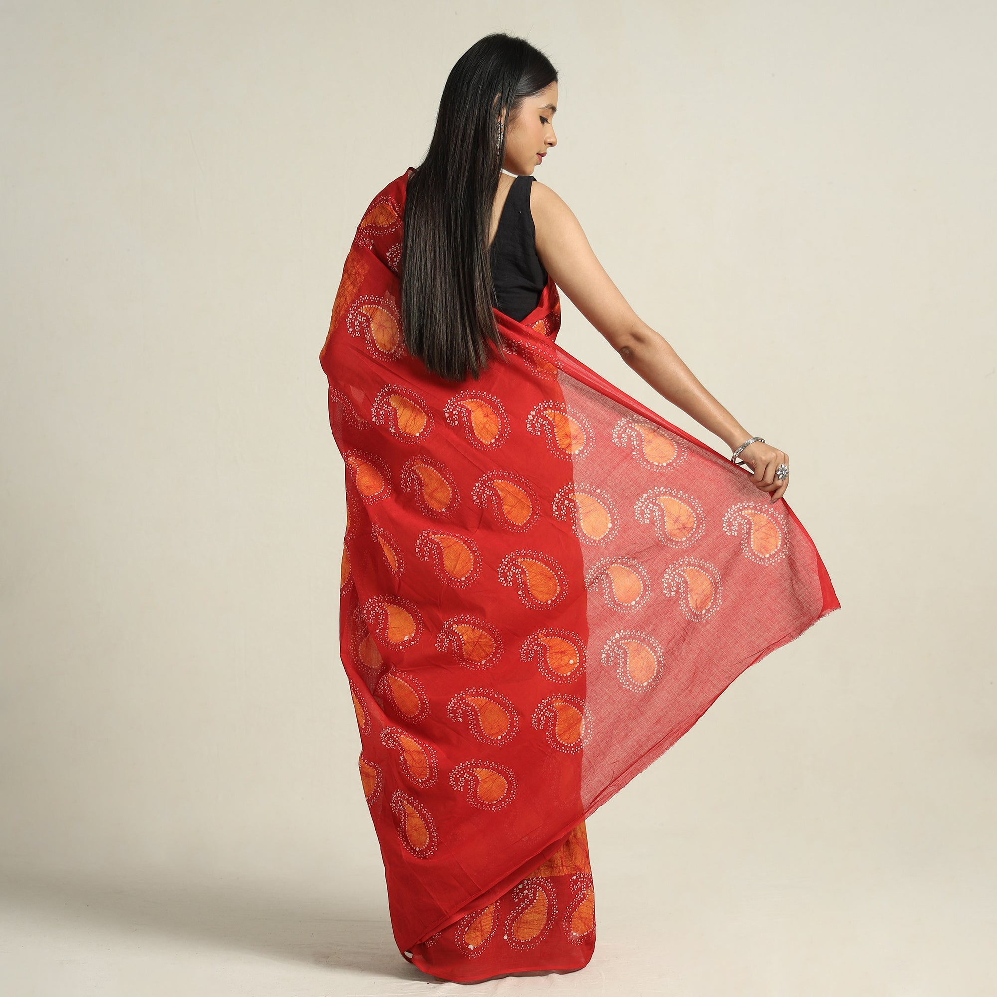 Fine quality hand batik block printed orange cotton sareefrom Ujjain, Madhya Pradesh. Batik printing is traditionally done using a manual wax-resist dyeing technique. Batik’s three-dimensional effect is attributed to the fine cracking of the wax on the cloth that allows small amounts of dye to seep into the cloth, thus giving the design a textural depth. The traditional designs and motifs in Indian batik are often passed down from one generation to another.