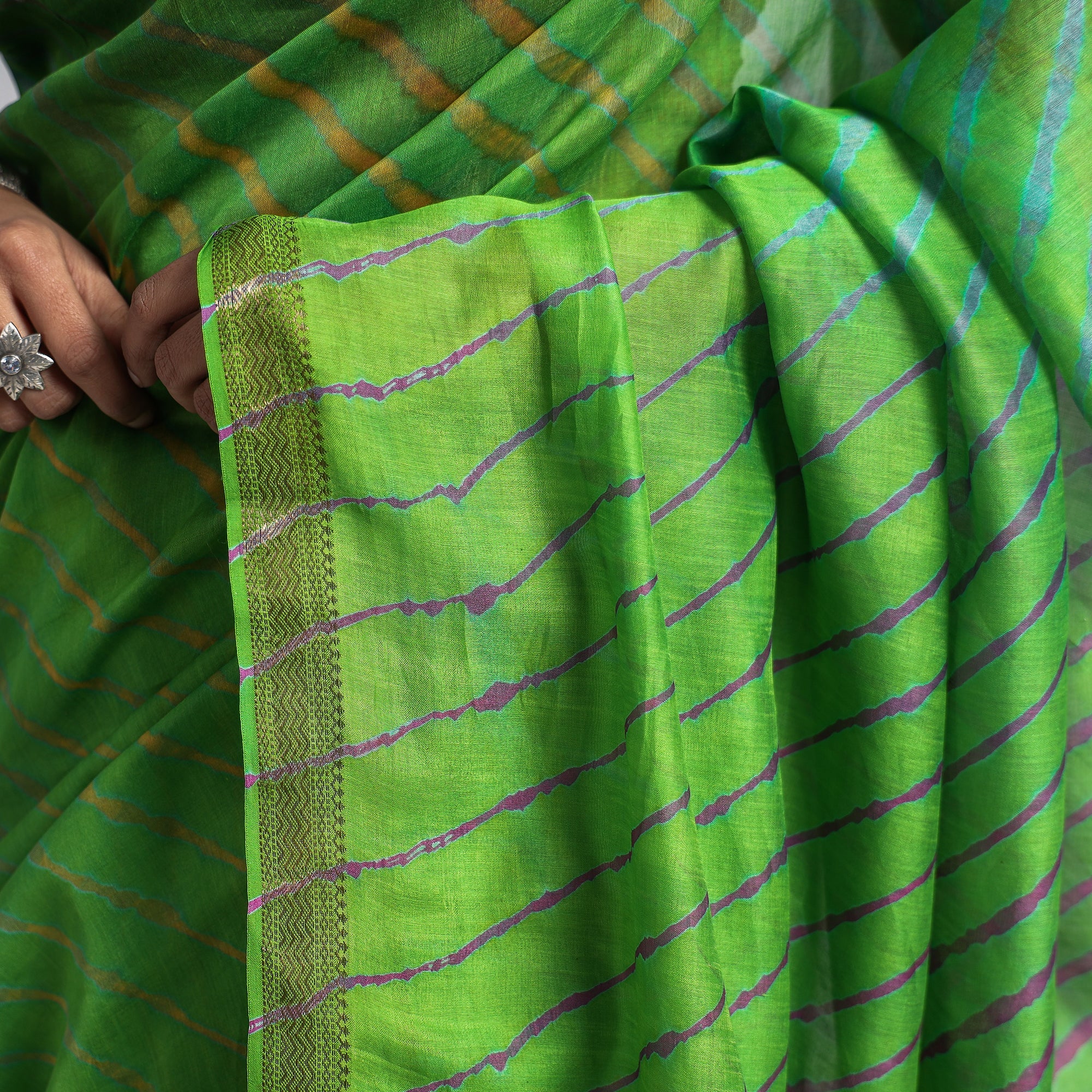 Fine quality green leheriya tie-dye chanderi silk-cotton saree with zari border. The wavy patterns on this saree has been dyed using leheriya tie & dye technique through traditional process by master artisan family of Badshah Miyan from the state of Rajasthan. Chanderi silks are known for its gossamer looks and amazing feel.