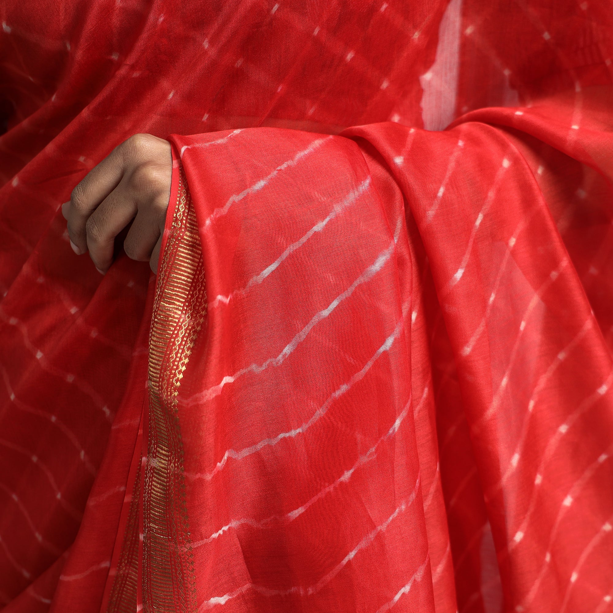 Fine quality red leheriya tie-dye mothra chanderi silk-cotton saree with zari border. The wavy patterns on this saree has been dyed using leheriya tie & dye technique through traditional process by master artisan family of Badshah Miyan from the state of Rajasthan. Chanderi silks are known for its gossamer looks and amazing feel.