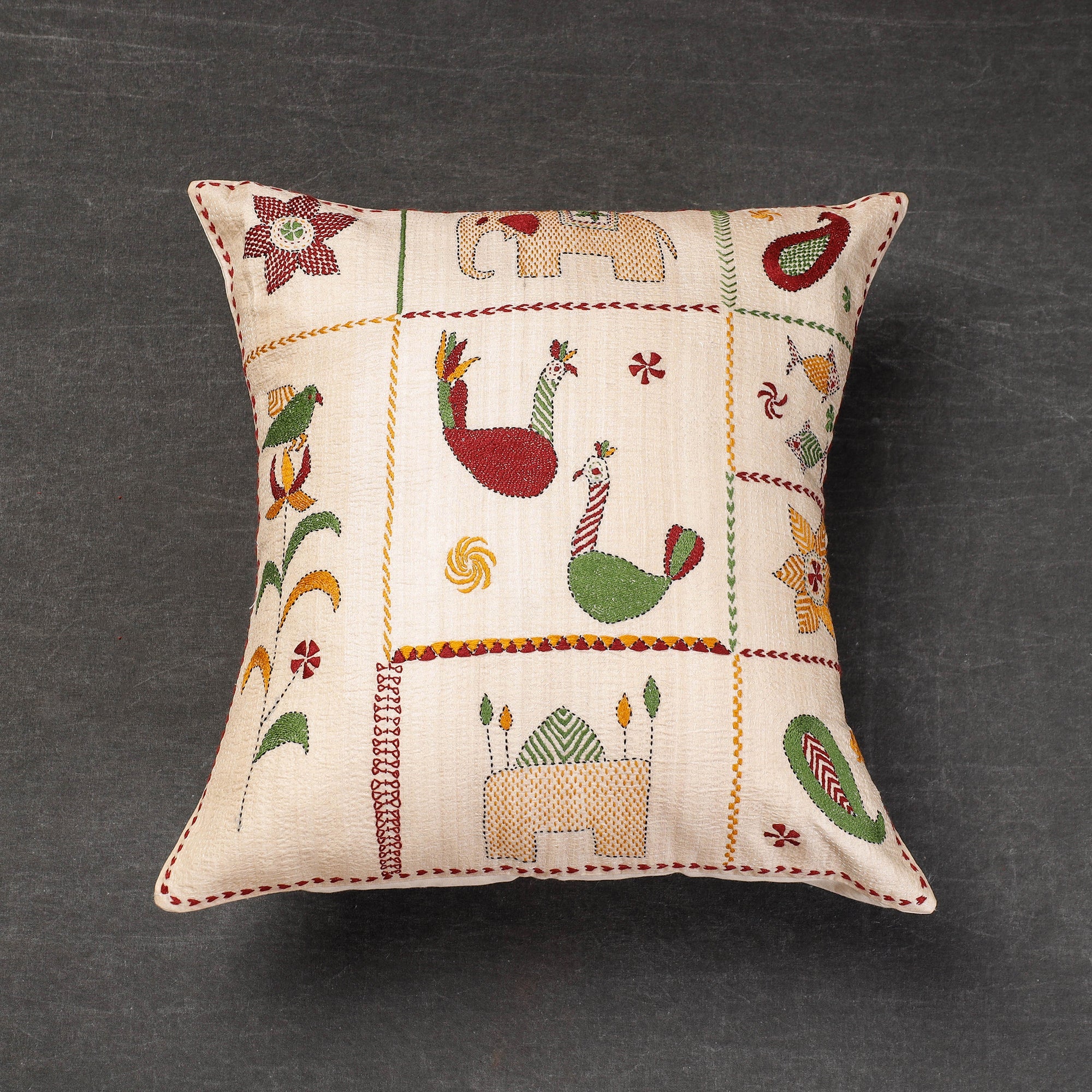 Fine quality kantha hand embroidery cushion cover made from pure mulberry & tussar silk fabric on front side and cotton fabric on backside. Designed with contemporary patterns & has been hand embroidered using West Bengal's traditional craft technique of Kantha.