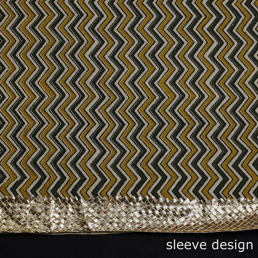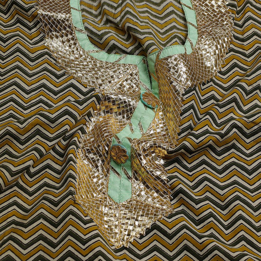 Fine quality gota patti work brown bagru dabu block printing cotton kurta material using natural dyes through traditional mud resist process by using hand carved wooden block practiced in Bagru, Rajasthan.