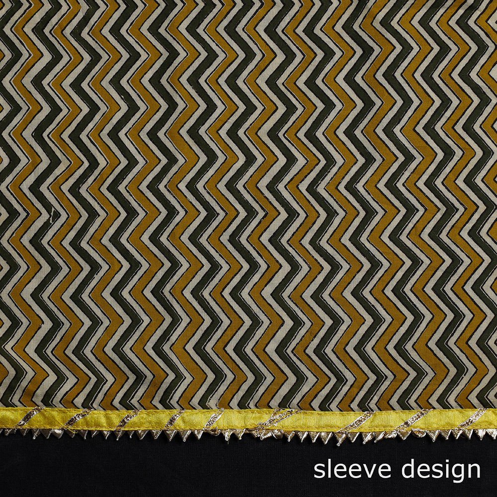 Fine quality gota patti work brown bagru dabu block printing cotton kurta material using natural dyes through traditional mud resist process by using hand carved wooden block practiced in Bagru, Rajasthan.