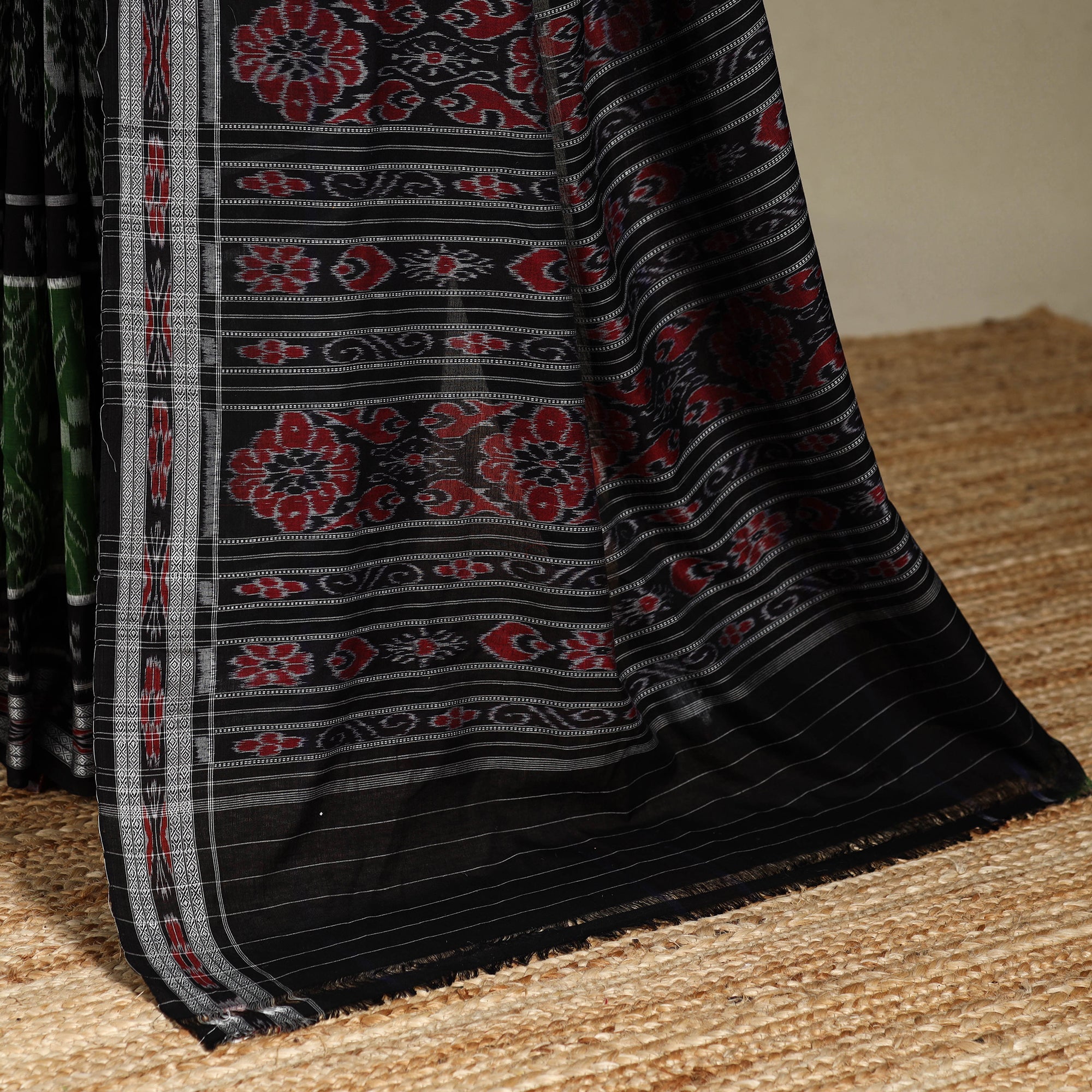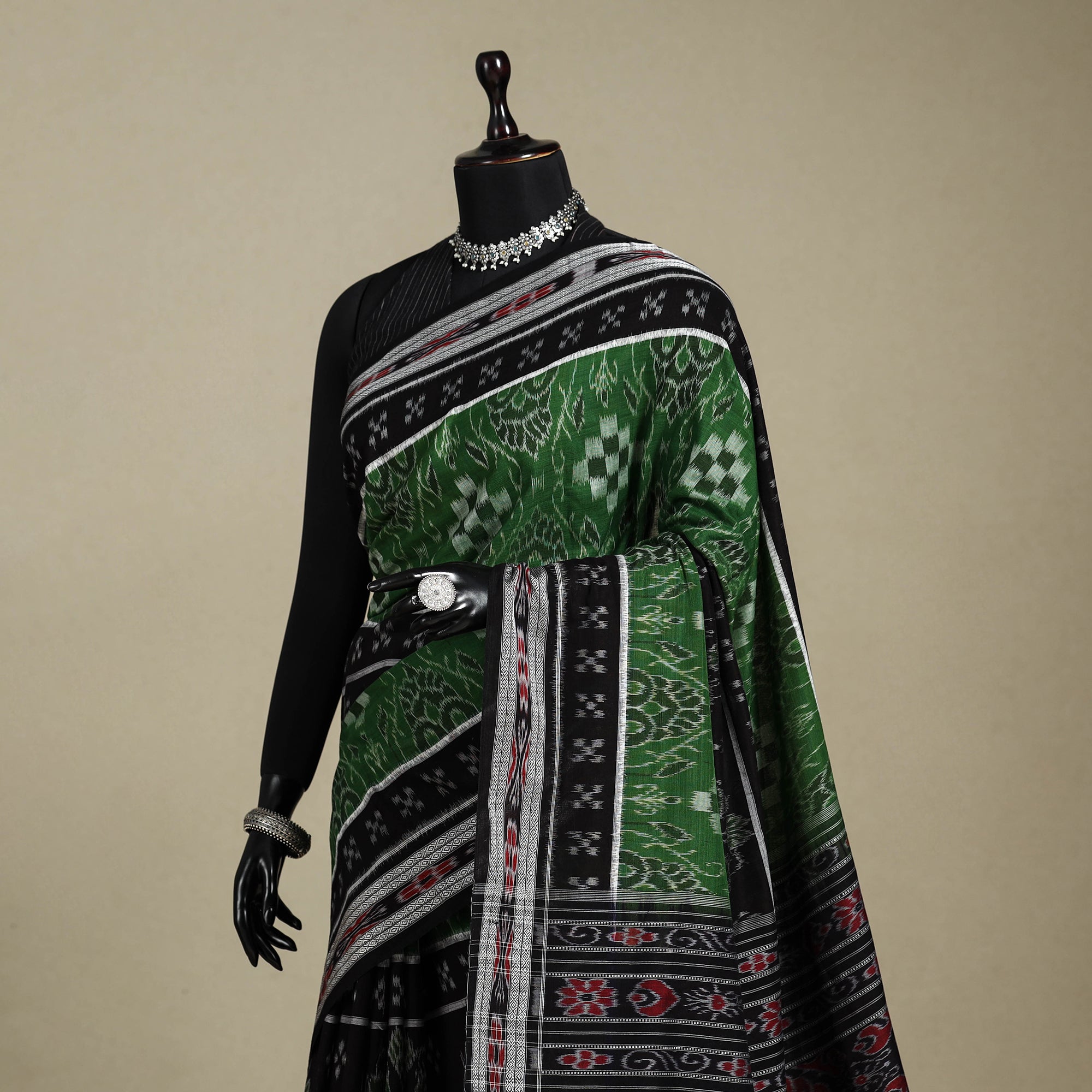 Fine quality authentic green sambalpuri ikat handloom pure cotton saree from Odisha with traditional motifs like shankha (shell), chakra (wheel), phula (flower) by master artisans from eastern states of India. Ikat (Ikkat) is a dyeing technique used to pattern textiles that employs a resist dyeing process similar to tie-dye on either the warp or weft fibers prior to dyeing. Ikat has lovely patterns and are world famous for their extremely beautiful colours, texture and designs. Indian Ikat is always admired by the fashion designers around the world.