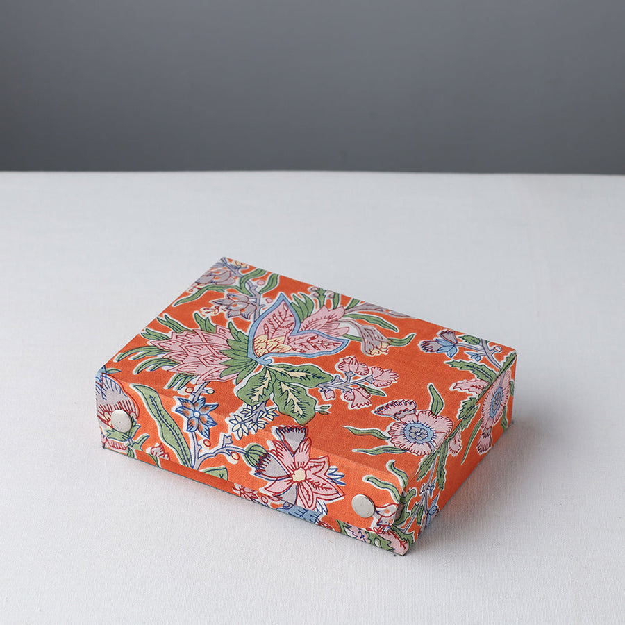 Orange handcrafted printed fabric jewelry box, made of hard board with printed cotton fabric outside & soft velvet lining inside. This jewelry box has 4 rectangular compartments to keep jewelry in order. It protect your beloved jewelry from scratch and dust.