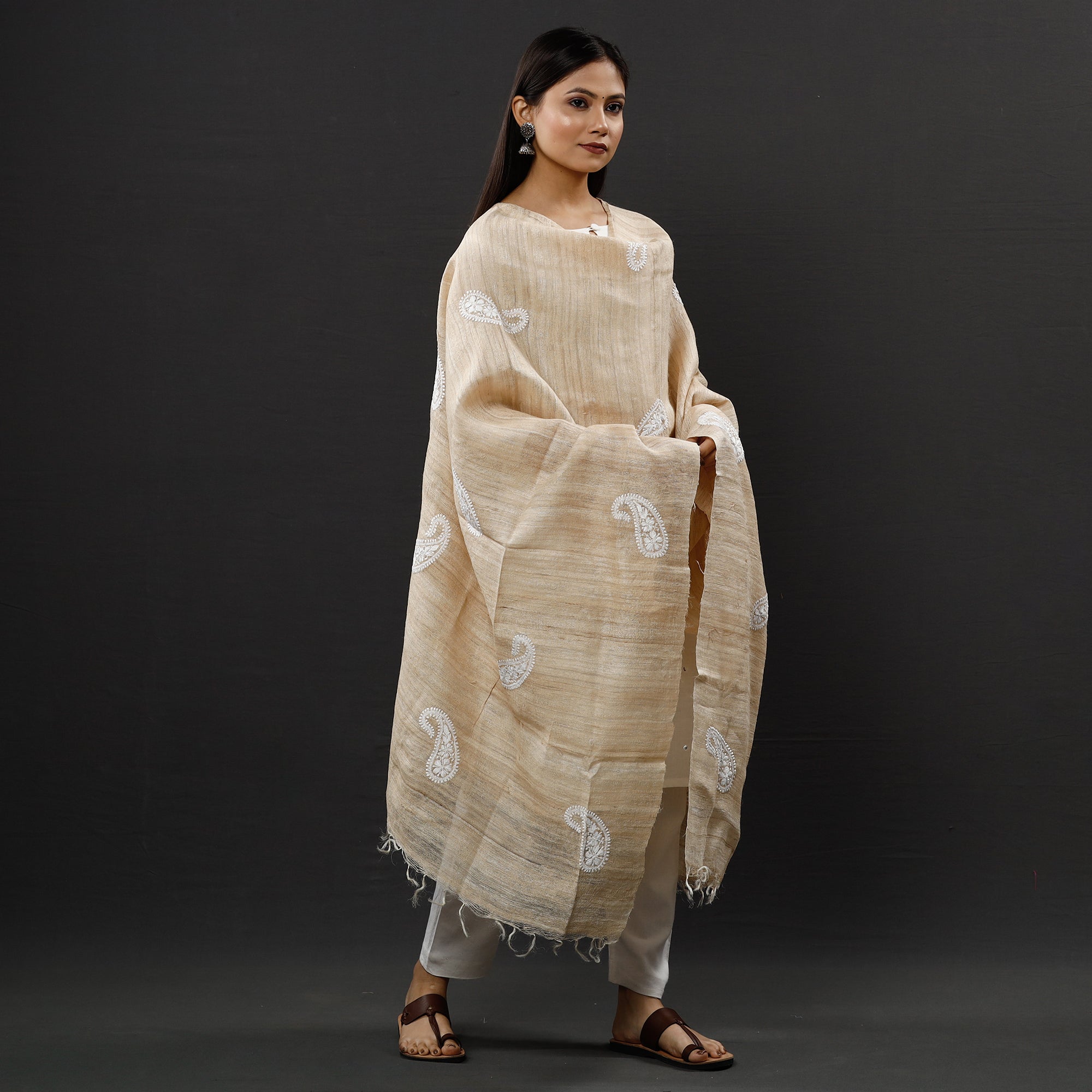Intricate and artfully done lucknow chikankari heavy hand embroidery ghicha silk dupatta. Chikankari is a traditional textile decorative from Lucknow. It is very delicate and intricate hand embroidery work where thread is embroidered on cool, pastel shades of light cotton garments.