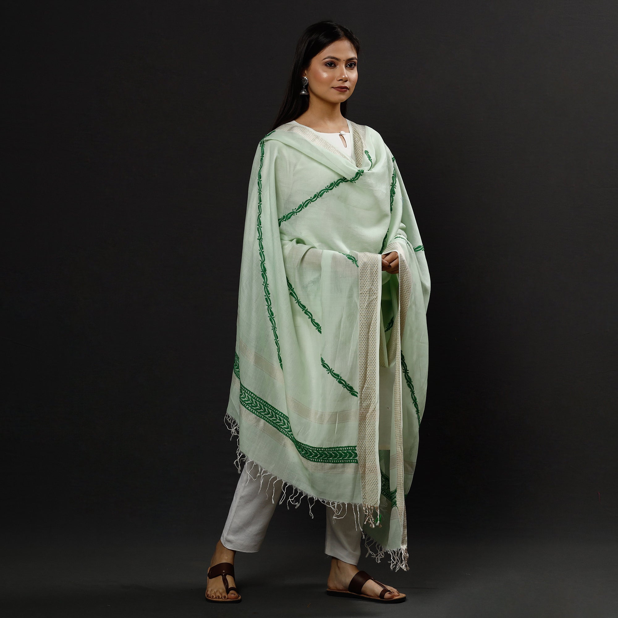 Intricate and artfully done lucknow chikankari hand embroidery maheshwari silk handloom dupatta. Chikankari is a traditional textile decorative from Lucknow. It is very delicate and intricate hand embroidery work where thread is embroidered on cool, pastel shades of light cotton garments.
