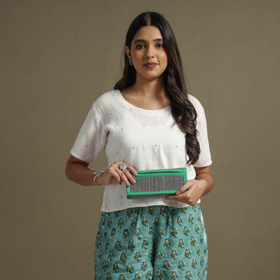 Handcrafted green audio tape clutch wallet by Green by Goonj. It has three zipper pockets, four card slots & one pocket inside. Ample space to keep most of your essentials. Each piece of Green by Goonj products is handcrafted using urban surplus unwearable/unusable material, which makes it unique and one of kind. They up-cycle the material which their team of women designers from the villages of India patch to create similar pieces each time.