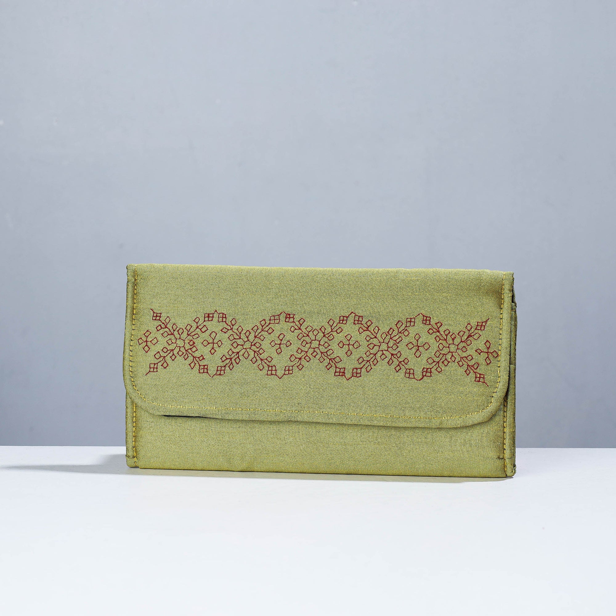Handcrafted green clutch wallet made from traditional kasuti embroidery on art silk fabric. Cotton lining from inside. It has two partitions & one zipper pocket inside. Ample space to keep most of your essentials.