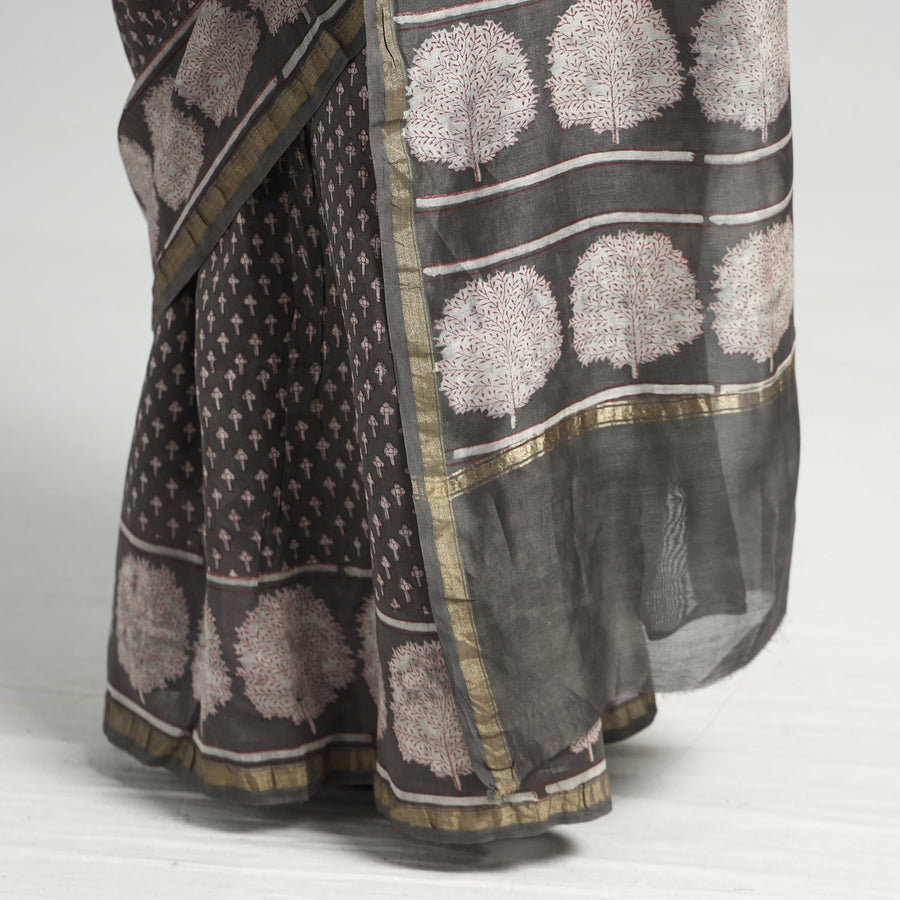 Fine quality traditional akola block printed chanderi silk cotton saree with zari border, made using natural dyes through traditional process of hand block printing practised by the master artisans in Akola village of Rajasthan. Chanderi silks are known for its gossamer looks and amazing feel.