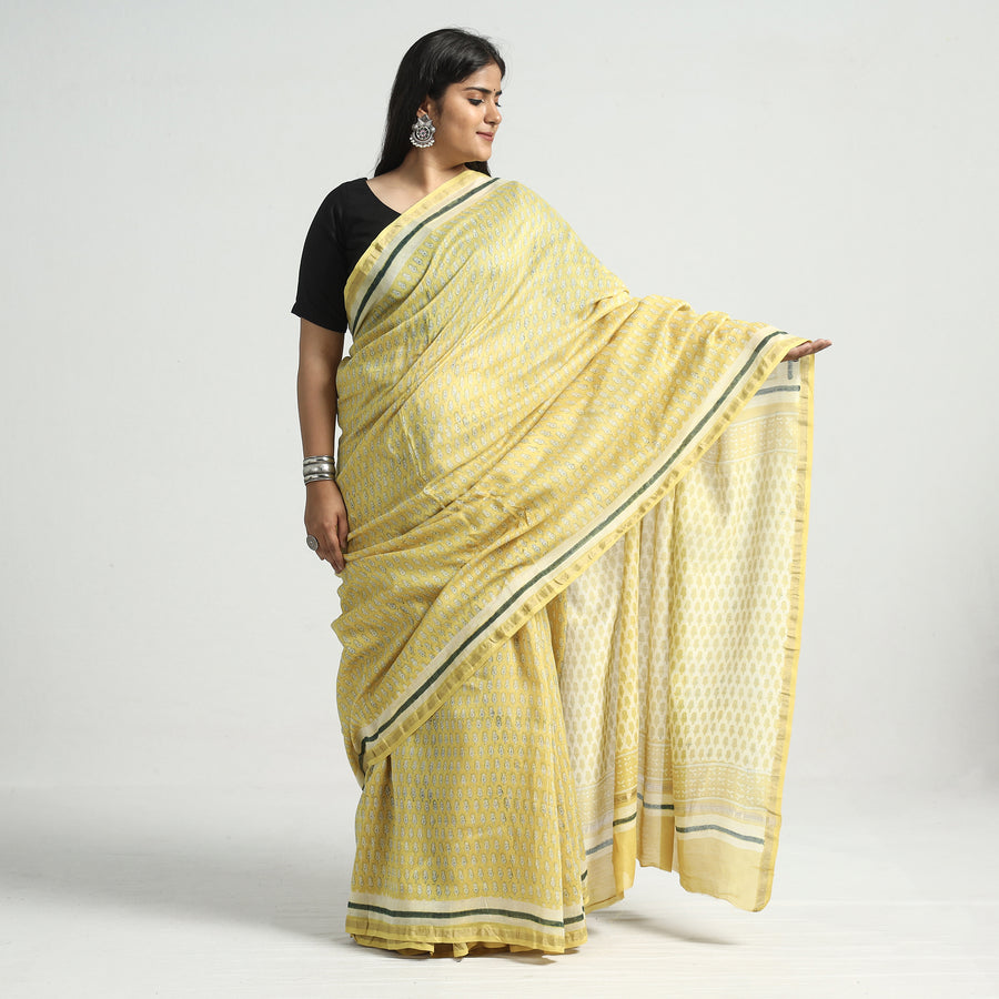 Fine quality traditional akola block printed chanderi silk cotton saree with zari border, made using natural dyes through traditional process of hand block printing practised by the master artisans in Akola village of Rajasthan. Chanderi silks are known for its gossamer looks and amazing feel.