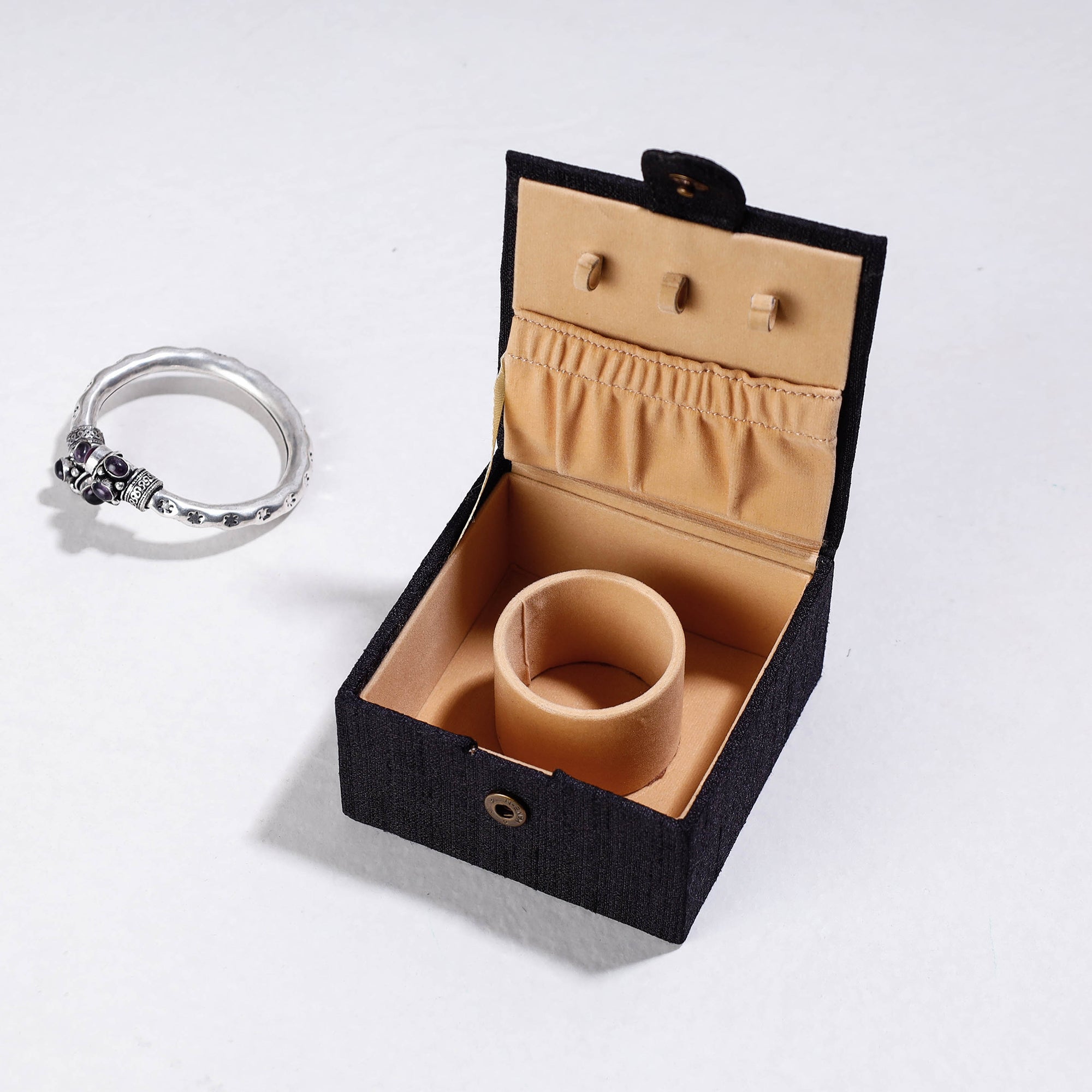 Fine quality handpainted black kalamkari natural dyed ghicha silk bangle box, made from craft board with handpainted kalamkari natural dyed cotton & ghicha silk fabric. It has one pocket & three hooks inside. This exquisite bangle box is created with handpainted kalamkari, wherein the "Bamboo kalam" is used for free hand drawing of the subject and filling in the colours. It is entirely hand worked using natural colours.