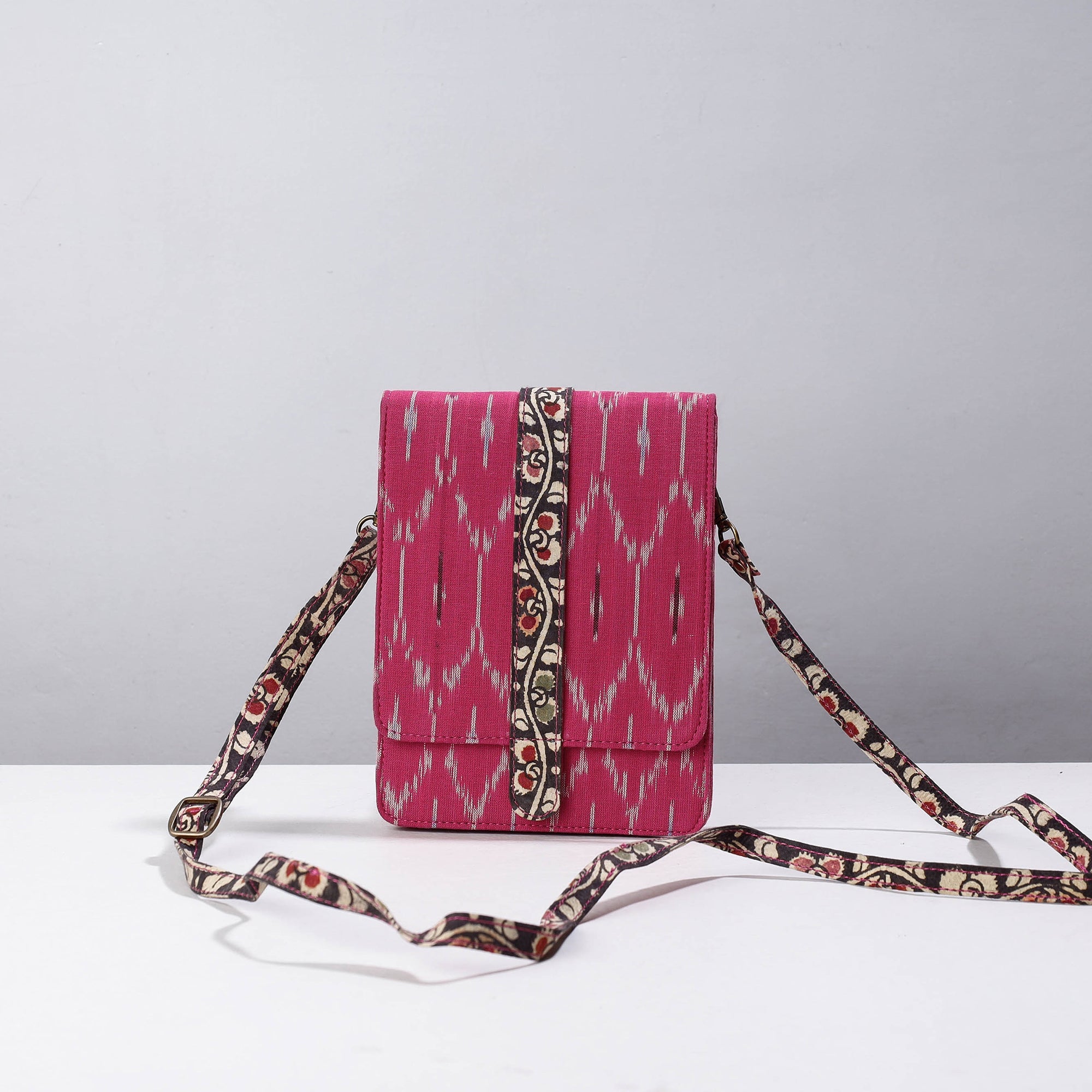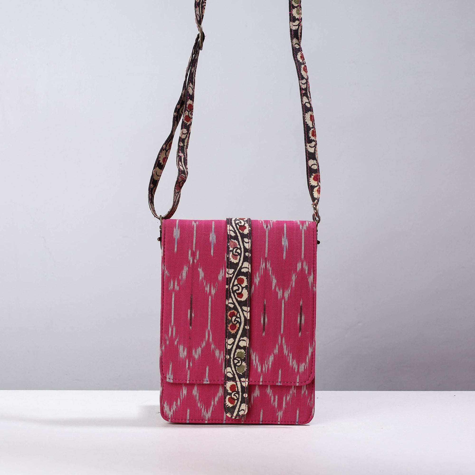 Fine quality pink handcrafted kalamkari natural dyed ikat cotton sling bag. It has three pocket inside. This exquisite sling bag is created with handpainted kalamkari work, where in the "Bamboo kalam" is used for free hand drawing of the subject and filling in the colours. It is entirely hand worked using natural colours.
