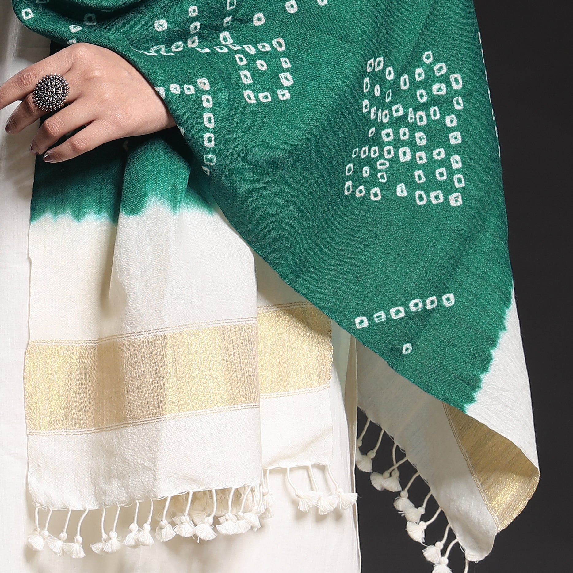 Fine green handwoven pure merino woolen stole featuring majestic bandhani tie-dye pattern with zari border made by craftsmen and women in Kutch region of Gujarat. The stole is woven with traditional Kutchi motifs. Soft textured.
