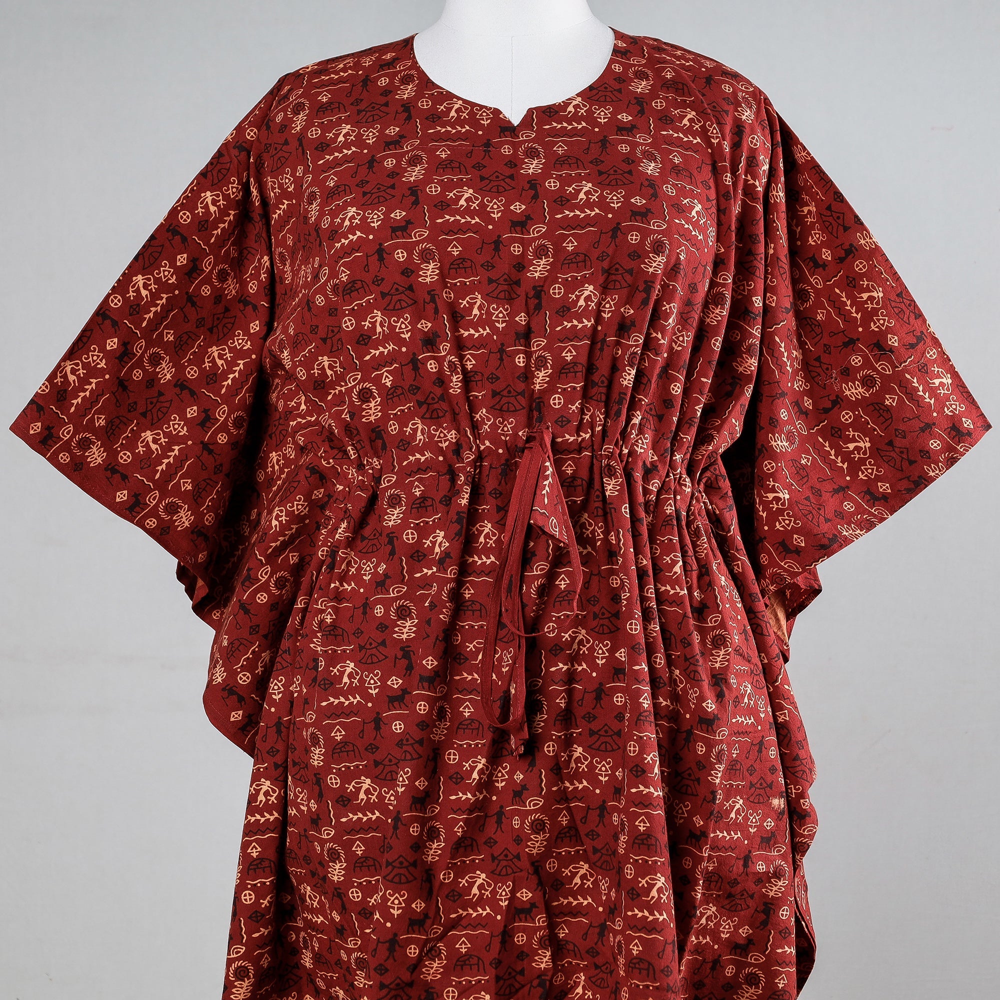 Red - Ajrakh Block Printed Cotton Kaftan with Tie-Up Waist (Medium)