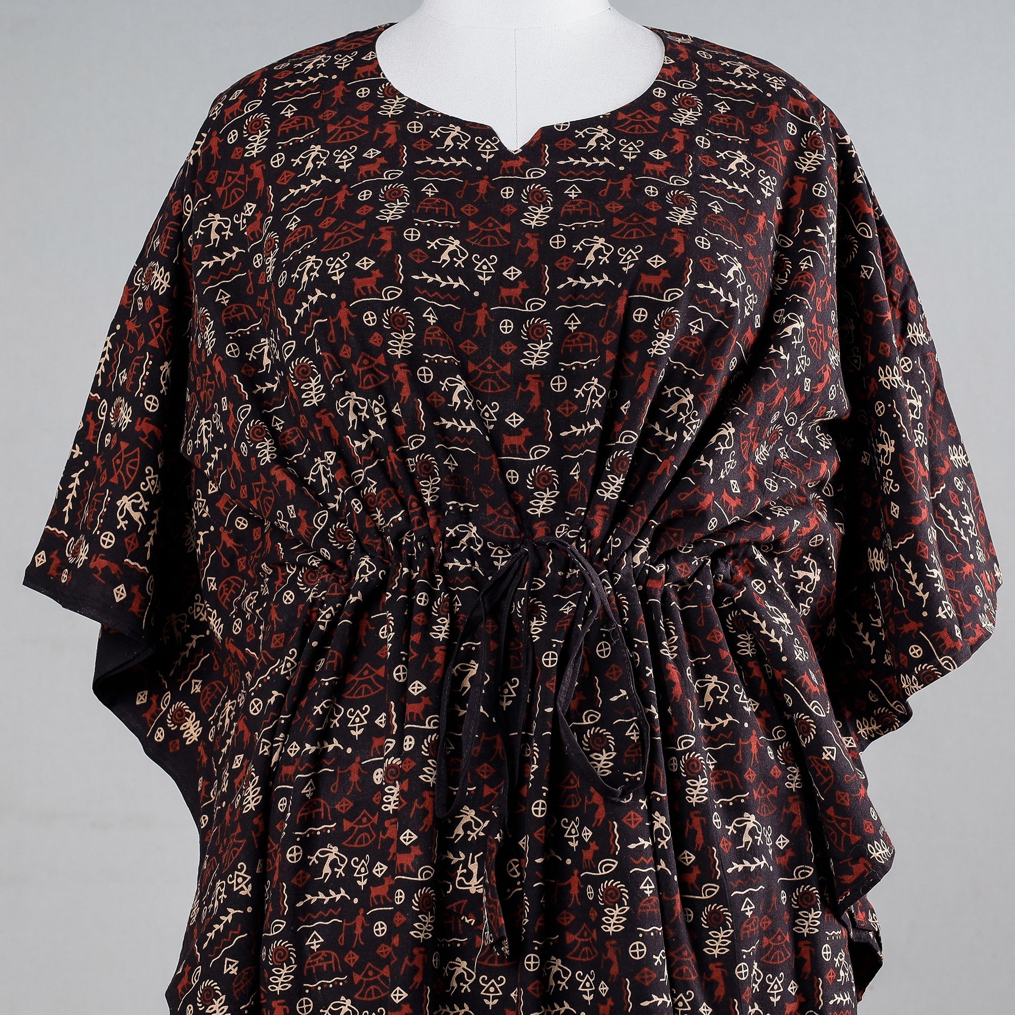 Black - Ajrakh Block Printed Cotton Kaftan with Tie-Up Waist (Medium)