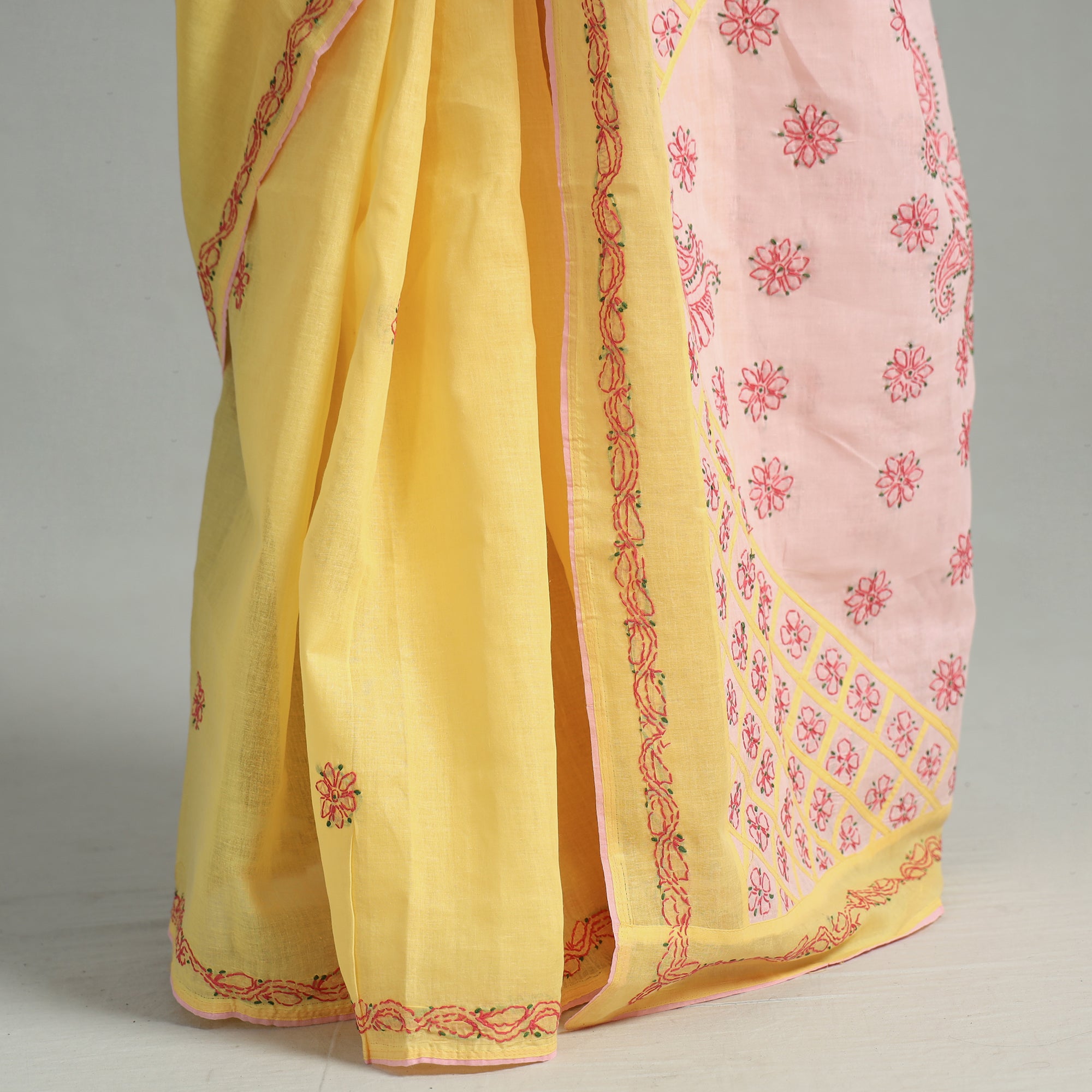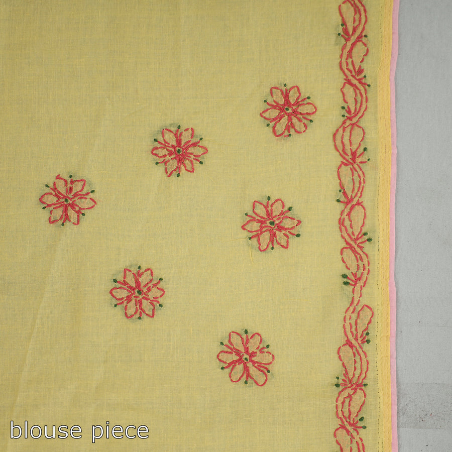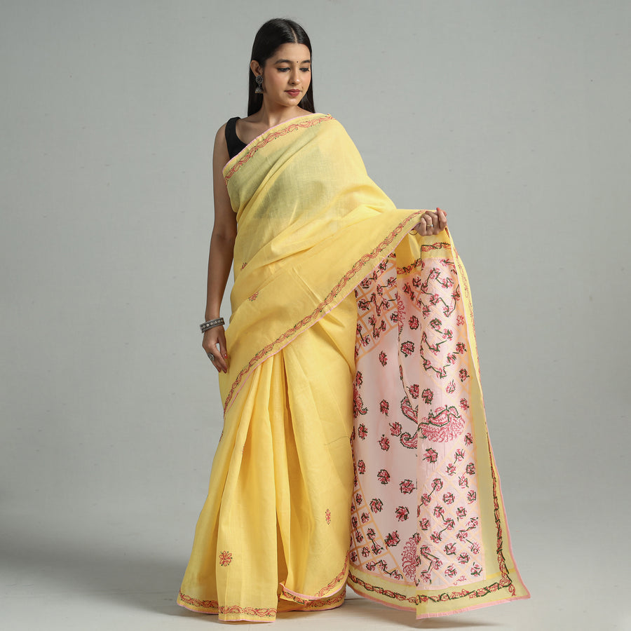 Intricate and artfully done Lucknowi Chikankari hand embroidered cotton saree. Chikankari is a traditional textile decorative from Lucknow. It is very delicate and intricate hand embroidery work where thread is embroidered on cool, pastel shades of light cotton garments.