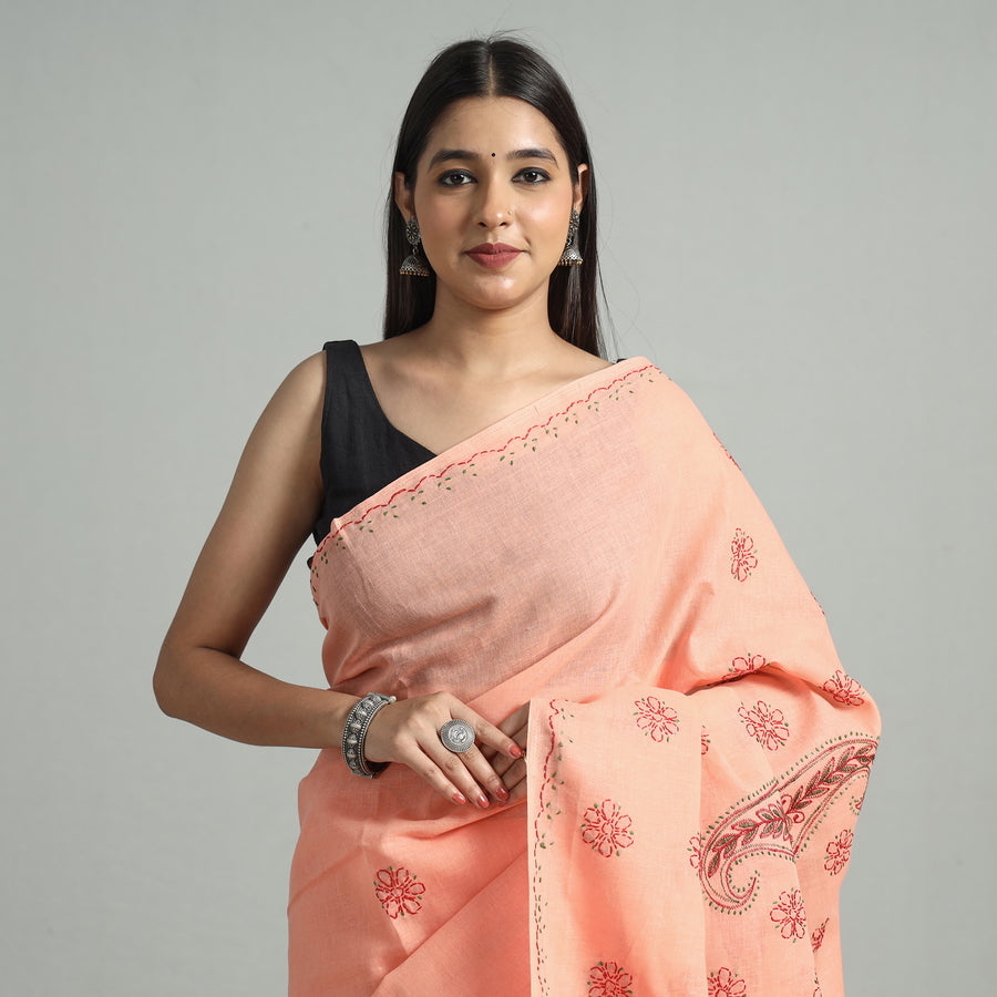 Intricate and artfully done Lucknowi Chikankari hand embroidered cotton saree. Chikankari is a traditional textile decorative from Lucknow. It is very delicate and intricate hand embroidery work where thread is embroidered on cool, pastel shades of light cotton garments.