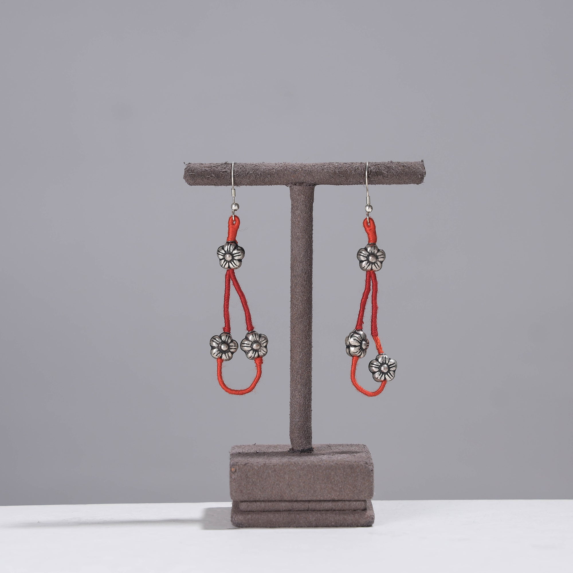 Red patwa earrings made from thick weaves of thread with metal & glass beads handcrafted by the master craftsmen Kailash Patwa. Patwa is a thread craft which originated in Rajasthan and is now practised in parts of Rajasthan. The word Patwa has been derived from the Hindi word ‘pat’ meaning silk and those involved in the silk and cotton thread business are called Patwas.