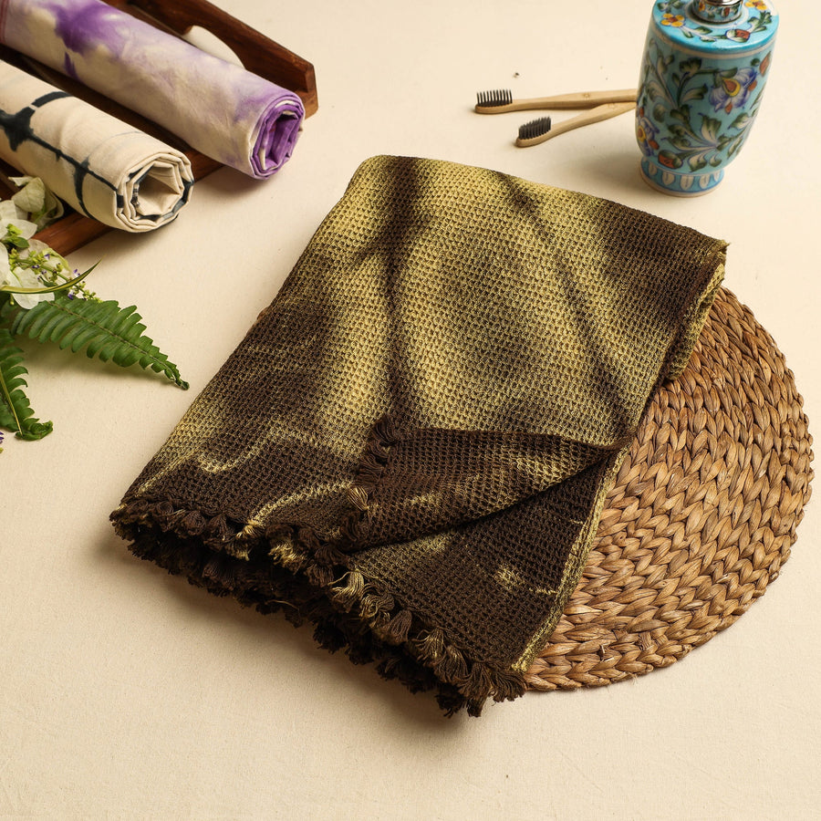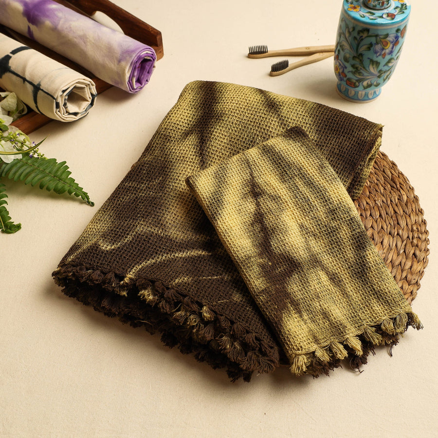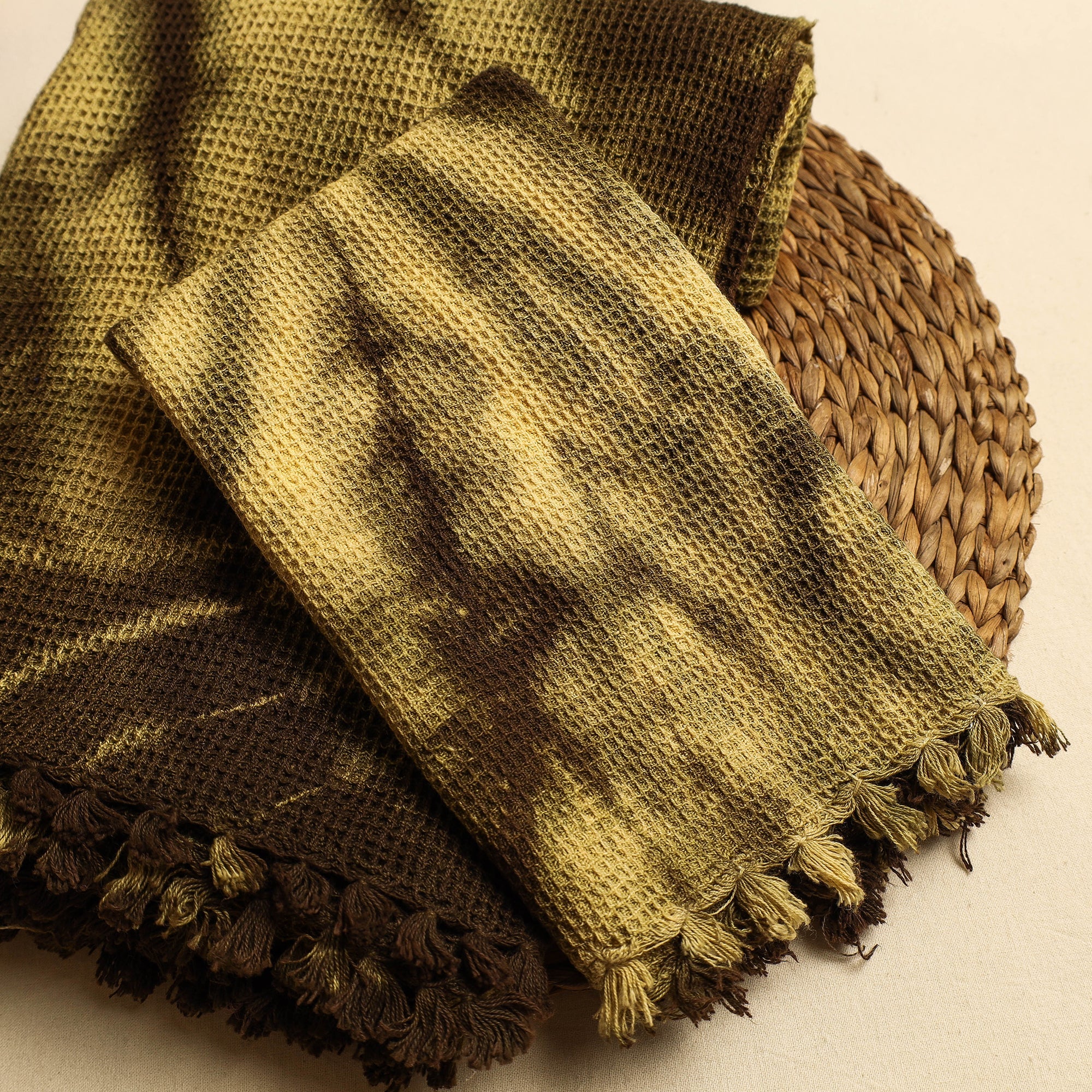 Fine quality brown pure handloom tye-dye cotton towel & napkin set, made by master artisans of Chhattisgarh. This towel & napkin set is hand dyed using tie and dye technique in which the fabric is tied using clamp or stitches in the required design and the pattern is dyed.