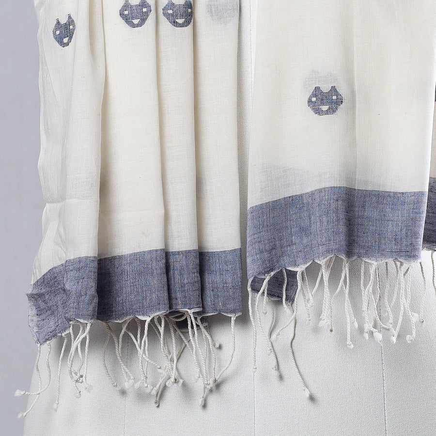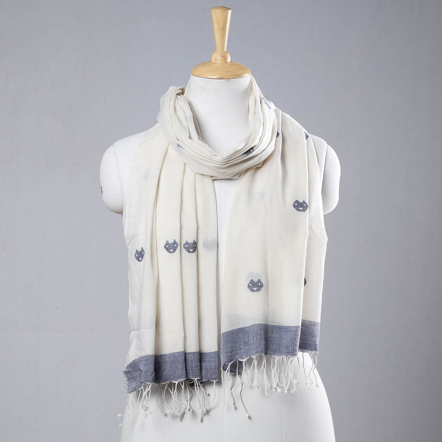 Fine quality pure handwoven off white dhakai muslin cotton jamdani stole practised in the Bardhaman (P.O. Kalna) of West Bengal. Jamdani is woven in several parts in india. The most famous of these places are in West Bengal especially Kalna, Tangail. Jyotish Debnath and Rajib Debnath from kalna are well known names in the fields of jamdani. Identified by its unique geometric and floral patterns woven into fine cotton, Debnath and his workers weave the most breathtaking forms of Jamdani onto muslin, a few counts higher than the original fabric. Today, Debnath and his artisans make the muslin from scratch, and the charkha is made in-house as well.