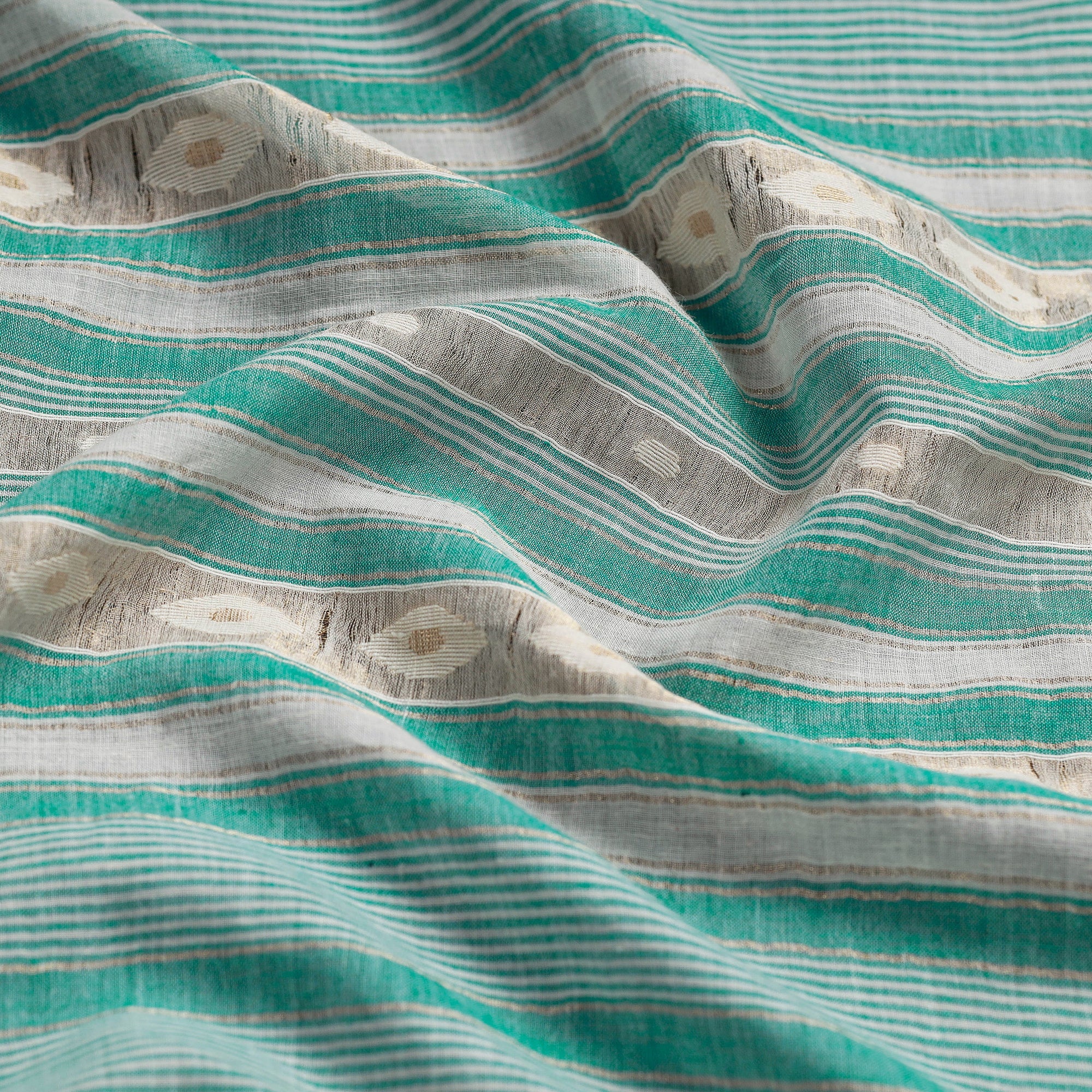 Fine quality pure green handwoven dhakai muslin cotton jamdani stole practised in the Bardhaman (P.O. Kalna) of West Bengal. Jamdani is woven in several parts in india. The most famous of these places are in West Bengal especially Kalna, Tangail. Jyotish Debnath and Rajib Debnath from kalna are well known names in the fields of jamdani. Identified by its unique geometric and floral patterns woven into fine cotton, Debnath and his workers weave the most breathtaking forms of Jamdani onto muslin, a few counts higher than the original fabric. Today, Debnath and his artisans make the muslin from scratch, and the charkha is made in-house as well.